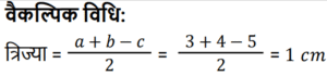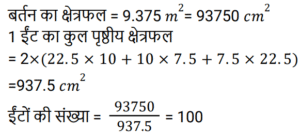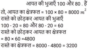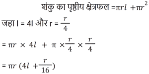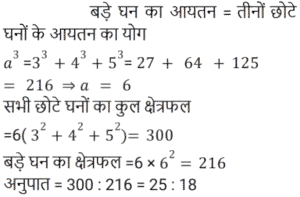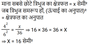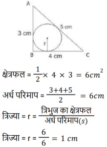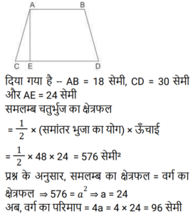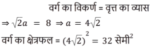 क्षेत्रमिति Part -7Total Questions: 5041. यदि एक वृत्त की त्रिज्या 4 cm है, तो पूरे वृत्त के अंदर फिट होने वाले सबसे बड़े वर्ग का क्षेत्रफल होगा? [RRB NTPC 11/02/2021 (Evening)](a) 64 cm²(b) 16 cm²(c) 30 cm²(d) 32 cm²Correct Answer: (d) 32 cm²Solution:42. मान लीजिए कि एक समलंब की दो समानांतर भुजाओं की लंबाई 30 cm और 18 cm है और 24 cm इन दोनों भुजाओं के बीच की दूरी है। यदि इस समलंब का क्षेत्रफल एक वर्ग के क्षेत्रफल के बराबर है, तो वर्ग का परिमाप क्या होगा? [RRB NTPC 12/02/2021 (Morning)](a) 87 cm(b) 66 cm(c) 96 cm(d) 75 cmCorrect Answer: (c) 96 cmSolution:43. एक बर्तन में पेंट 9.375 m² के बराबर क्षेत्र को पेंट करने के लिए पर्याप्त है। बर्तन में पेंट के साथ 22.5 cm × 10 cm × 7.5 cm माप वाली कितनी ईंटें पेंट की जा सकती हैं? [RRB NTPC 12/02/2021 (Morning)](a) 170(b) 120(c) 100(d) 150Correct Answer: (c) 100Solution:44. दो समरूप त्रिभुजों के शीर्षलंब 4 cm and 6 cm हैं। यदि बड़े त्रिभुज का क्षेत्रफल 36 cm² है, तो दूसरे त्रिभुज का क्षेत्रफल क्या होगा? [RRB NTPC 12/02/2021 (Morning)](a) 16 cm²(b) 36 cm²(c) 49 cm²(d) 25 cm²Correct Answer: (a) 16 cm²Solution:45. एक आयताकार मैदान है जिसकी विमाएँ क्रमशः: 100 m और 80 m हैं। यदि एक समान चौड़ाई का 10 मीटर का पथ उसके चारों ओर और उसके अंदर चलता है, तो पथ का क्षेत्रफल क्या होगा? [RRB NTPC 12/02/2021 (Morning)](a) 3400 m²(b) 3800 m²(c) 3200 m²(d) 3500 m²Correct Answer: (c) 3200 m²Solution:46. ABC एक समकोण त्रिभुज है। यदि समकोण वाली दो भुजाओं की लंबाई 4 cm और 3 cm है। इसके भीतर वाले वृत्त की त्रिज्या क्या होगी? [RRB NTPC 15/02/2021 (Morning)](a) 1 cm(b) 4 cm(c) 2 cm(d) 3 cmCorrect Answer: (a) 1 cmSolution:47. एक वस्तु एक समलंब के रूप में है जिसकी ऊँचाई 5 m और समानांतर भुजाएँ 4 m और 6 m हैं। वस्तु को पेंट करने की लागत क्या है, यदि पेंटिंग की दर 50 प्रति वर्ग मीटर रुपये है? [RRB NTPC 15/02/2021 (Morning)](a) Rs. 1,250(b) Rs. 800(c) Rs. 1,000(d) Rs. 1,200Correct Answer: (a) Rs. 1,250Solution:48. एक शंकु के कुल पृष्ठीय क्षेत्रफल की गणना कीजिए यदि त्रिज्या r/4 है और इसकी तिर्यक ऊँचाई 4l है। [RRB NTPC 15/02/2021 (Evening)](a)(b)(c)(d)Correct Answer: (c)Solution:49. 3 cm, 4 cm और 5 cm प्रत्येक भुजा वाले तीन छोटे घनों को पिघलाकर एक बड़ा घन बनाया जाता है। तीन छोटे घनों के पृष्ठीय क्षेत्रफलों का एक साथ बड़े घन से अनुपात है: [RRB NTPC 17/02/2021 (Morning)](a) 25 : 18(b) 27 : 64(c) 18 : 25(d) 9 : 4Correct Answer: (a) 25 : 18Solution:50. एक कमरे के फर्श का परिमाप 18 मीटर है। कमरे की दीवारों का क्षेत्रफल क्या है, यदि कमरे की ऊँचाई 3 मीटर है? [RRB NTPC 22/02/2021 (Morning)](a) 54 m²(b) 21 m²(c) 108 m²(d) 42 m²Correct Answer: (a) 54 m²Solution:Submit Quiz« Previous12345