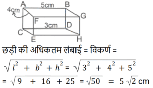 12. एक आयताकार बॉक्स की भुजाएँ 3, 4 और 5 सेमी हैं। डिब्बे के अंदर रखी जा सकने वाली छड़ी की अधिकतम लंबाई कितनी होगी? [RRB NTPC 01/04/2021 (Evening)]