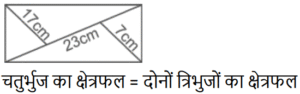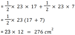 19. एक चतुर्भुज में, इसके एक विकर्ण की लंबाई 23 सेमी है और इस विकर्ण पर अन्य दो शीर्षों से खींचे गए लंबों की माप क्रमशः: 17 सेमी और 7 सेमी है। चतुर्भुज का क्षेत्रफल ज्ञात कीजिए। [RRB NTPC 03/04/2021 (Evening)]