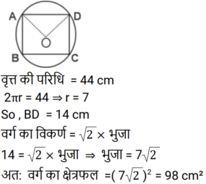 20. सबसे बड़े वर्ग का क्षेत्रफल ज्ञात कीजिए जिसे 44 सेमी परिधि के एक वृत्त में अंकित किया जा सकता है। [RRB NTPC 03/04/2021 (Evening)]
