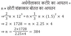 15. 12 सेमी की आंतरिक त्रिज्या के एक गोलार्द्ध के कटोरे में एक तरल होता है। इस तरल को आधार व्यास 3 सेमी और ऊँचाई 4 सेमी की शंकाकार आकार की छोटी बोतलों में भरा जाना है। कटोरा खाली करने के लिए समान प्रकार की कितनी बोतलों की आवश्यकता होगी? [RRB NTPC 03/04/2021 (Morning)]