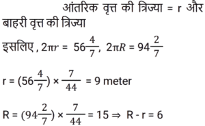 18. दो संकेंद्रित वृत्त एक वृत्ताकार पथ बनाते हैं। पथ की आंतरिक और बाहरी परिधि क्रमशः: 56 ⁴⁄₇ मीटर और 94 ²⁄₇ मीटर है। पथ की चौड़ाई ज्ञात कीजिए। [RRB NTPC 03/04/2021 (Morning)]