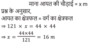 31. 121 मीटर लंबे एक आयत का क्षेत्रफल 44 मीटर भुजा वाले वर्ग के क्षेत्रफल के बराबर है। आयत की चौड़ाई ज्ञात कीजिए। [RRB NTPC 07/04/2021 (Evening)]