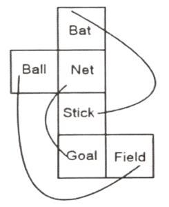 घन और पासा (भाग-I)Total Questions: 5031. K, B, V, M, P और T फलकों वाले एक ही पासे की दो अलग-अलग स्थितियाँ नीचे दिखाई गई हैं। उस अक्षर का चयन कीजिए जो B अक्षर वाले फलक के विपरीत फलक पर होगा। [SSC CGL 18/09/2024 (3rd Shift)](a) V(b) P(c) K(d) MCorrect Answer: (d) MSolution:दोनों पासों के विपरीत फलक हैं V ↔ P, B ↔ M, K ↔ T32. एक पासे के विभिन्न फलकों पर छह रोमन संख्याएँI, II, III, IV, V और VI अंकित की गई हैं। नीचे चित्र में इस पासेकी दो स्थितियों को दिखाया गया है। संख्या 'VI' के विपरीत फलक पर आने वाली रोमन संख्या ज्ञात कीजिए। [SSC CGL 19/09/2024 (1st Shift)](a) V(b) II(c) III(d) IVCorrect Answer: (b) IISolution:दोनों पासों में दो रोमन संख्याएँ (III,V) उभयनिष्ठ हैं। अतः , 'VI' का विपरीत फलक 'II' है।33. एक पासे के विभिन्न फलकों पर छ: संख्याएँ5, 6, 7, 8, 9 और 10 लिखी गई हैं। इस पासे की दो स्थितियों को नीचे आकृति में दर्शाया गया है। '7' के विपरीत फलक पर संख्या ज्ञात कीजिए। [SSC CGL 19/09/2024 (1st Shift)](a) 6(b) 9(c) 8(d) 10Correct Answer: (d) 10Solution:दोनों पासों में दो संख्याएँ (8, 9) उभयनिष्ठ हैं। तो, '7' का विपरीत फलक '10' है।34. एक पासे के विभिन्न फलकों पर छह अक्षर X, T, S, M, R और O लिखे गए हैं। इस पासे की दो स्थितियाँ नीचे चित्र में दर्शाई गई हैं। R के विपरीत वाले फलक पर आने वाला अक्षर ज्ञात कीजिए। [SSC CGL 19/09/2024 (2nd Shift)](a) S(b) O(c) T(d) MCorrect Answer: (a) SSolution:दोनों पासों के विपरीत फलक हैं, T ↔ M, S ↔ R, X ↔ O35. दी गई शीट को दर्शाई गई रेखाओं के अनुदिश मोड़कर एक घन का निर्माण किया जाता है। इस प्रकार बनने वाले घन में, 'Ball' के विपरीत फ़लक पर कौन-सा शब्द होगा? [SSC CGL 19/09/2024 (2nd Shift)](a) Field(b) Goal(c) Stick(d) BatCorrect Answer: (a) FieldSolution:जैसा कि हम देख सकते हैं, विपरीत फलक हैं। Ball ↔ Field, Bat ↔ stick, Net ↔ Goal इसलिए, ' ‘Field, Ball’ के विपरीत है।36. एक पासे के विभिन्न फलकों पर छह अक्षर P, J, U, W, L और K लिखे गए हैं। इस पासे की दो स्थितियाँ नीचे चित्र में दर्शाई गई हैं। P के विपरीत वाले फलक पर आने वाला अक्षर ज्ञात कीजिए। [SSC CGL 23/09/2024 (1st Shift)](a) U(b) K(c) W(d) JCorrect Answer: (c) WSolution:दोनों पासों के विपरीत फलक हैं J ↔ K , P ↔ W, U ↔ L37. एक पासे के विभिन्न फलकों पर छह अक्षर O, Z, F, T, R और M लिखे गए हैं। इस पासे की दो स्थितियाँ नीचे चित्र में दर्शाई गई हैं। Z के विपरीत वाले फलक पर आने वाला अक्षर ज्ञात कीजिए। [SSC CGL 23/09/2024 (3rd Shift)](a) T(b) F(c) R(d) MCorrect Answer: (d) MSolution:दोनो पासों के विपरीत फलक हैं Z ↔ M , O ↔ T , F ↔ R38. एक पासे के विभिन्न फलकों पर छह शब्द 'खाना' ('Eat'), 'खेलना' ('Play'), 'रोना'('Cry') , 'सोना' ('Sleep'), 'नाचना' ('Dance') और 'दौड़ना' ('Run') लिखे हुए हैं। नीचे चित्र में इस पासे की दो स्थितियों को दिखाया गया है। 'खाना' ('Eat') शब्द के विपरीत फलक पर कौन-सा शब्द होगा ? [SSC CGL 24/09/2024 (1st Shift)](a) रोना (Cry)(b) खेलना (Play)(c) नाचना (Dance)(d) सोना (Sleep)Correct Answer: (c) नाचना (Dance)Solution:दोनों पासों से हम देख सकते हैं कि ‘खेलना’ (play) और रोना (cry) सामान्य है। अतः , 'नृत्य', 'खाना' के विपरीत होगा।39. एक पासे के विभिन्न फलकों पर छ: अक्षर M, N, O, P, Q और R लिखे गए हैं। नीचे दिए गए चित्र में इस पासे की दो स्थितियों को दर्शाया गया है। दिए गए विकल्पों में से O के विपर