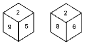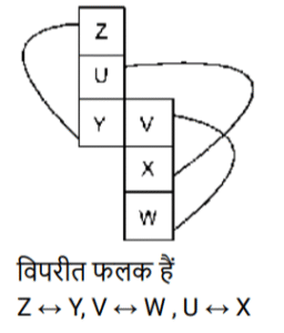 घन और पासा (भाग-I)Total Questions: 5041. नीचे एक ही पासे की दो अलग-अलग स्थितियाँ दी गई हैं। संख्या 5 वाले फलक के विपरीत फलक पर कौन-सी संख्या है ? [SSC CGL 24/09/2024 (3rd Shift)](a) 6(b) 2(c) 1(d) 3Correct Answer: (c) 1Solution:दो पासों के विपरीत युग्म इस प्रकार हैं, 2 ↔ 6 , 3 ↔ 4 , 1 ↔ 542. नीचे एक ही पासे की दो अलग-अलग स्थितियाँ दी गई हैं। संख्या 5 वाले फलक के विपरीत फलक पर कौन-सी संख्या है? [SSC CGL 25/09/2024 (2nd Shift)](a) 1(b) 6(c) 2(d) 3Correct Answer: (a) 1Solution:दोनों पासों के विपरीत फलक हैं 6 ↔ 3 , 1 ↔ 5 , 2 ↔ 443. 9, 2, 5, 3, 8 और 6 फलकों वाले एक ही पासे की दो अलग-अलग स्थितियाँ नीचे दिखाई गई हैं। उस संख्या का चयन कीजिए जो 2 संख्या वाले फलक के विपरीत फलक पर होगी। [SSC CGL 25/09/2024 (3rd Shift)](a) 6(b) 9(c) 3(d) 5Correct Answer: (c) 3Solution:दोनों पासों के विपरीत फलक हैं 2 ↔ 3 , 5 ↔ 6, 9 ↔ 844. Z, G, M, F, H और S फलकों वाले एक ही पासे की दो अलग-अलग स्थितियाँ नीचे दिखाई गई हैं। उस अक्षर का चयन कीजिए जो G अक्षर वाले फलक के विपरीत फलक पर होगा। [SSC CGL 26/09/2024 (2nd Shift)](a) H(b) M(c) S(d) FCorrect Answer: (d) FSolution:दोनों पासों के विपरीत फलक हैं Z ↔ S , M ↔ H, G ↔ F45. एक पासे के विभिन्न फलकों पर छह अक्षर I, O, A, Y, Z और X लिखे गए हैं। इस पासे की दो स्थितियाँ नीचे चित्र में दर्शाई गई हैं। O के विपरीत वाले फलक पर आने वाला अक्षर ज्ञात कीजिए। [SSC CGL 26/09/2024 (3rd Shift)](a) A(b) Z(c) X(d) YCorrect Answer: (d) YSolution:दोनों पासों के विपरीत फलक हैं I ↔ X , A ↔ Z , O ↔ Y46. यदि नीचे दी गई शीट को मोड़ कर एक घन बनाया जाए तो ≠ के विपरीत फ़लक पर कौन-सा चिन्ह होगा? [SSC CHSL 01/07/2024 (1st Shift)](a) ∞(b) %(c) µ(d) ¥Correct Answer: (b) %Solution:विपरीत फलक % ↔ ≠ , µ ↔ ¥ , ∞ ↔π47. यदि नीचे दी गई शीट को मोड़कर एक घन बनाया जाए तो 'Y के विपरीत फ़लक पर कोन-सा अक्षर होगा ? [SSC CHSL 01/07/2024 (1st Shift)](a) V(b) Z(c) X(d) WCorrect Answer: (b) ZSolution:48. एक पासे के अलग-अलग फलकों पर छः संख्याएं 1, 3, 5, 6, 7 और 8 अंकित हैं। निम्न आकृति में इसी पासे की दो अलग-अलग स्थितियां दर्शाई गई हैं। संख्या 6 वाले फलक के विपरीत फलक पर कौन-सी संख्या है ? [SSC CHSL 01/07/2024 (1st Shift)](a) 5(b) 3(c) 7(d) 8Correct Answer: (b) 3Solution:दोनों पासों के विपरीत फलक हैं 1 ↔ 7 , 8 ↔ 5 , 3 ↔ 649. यदि नीचे दी गई शीट को मोड़कर एक घन बनाया जाए तो 'Blue' शब्द के विपरीत फलक पर कौन-सा शब्द होगा ? [SSC CHSL 01/07/2024 (2nd Shift)](a) Black(b) White(c) Pink(d) RedCorrect Answer: (a) BlackSolution:विपरीत फलक हैं Red ↔ Pink, Green ↔ White , Blue ↔ Black50. यदि नीचे दी गई शीट को मोड़कर एक घन बनाया जाए तो ‘20' के विपरीत फलक पर कौन-सी संख्या होगी ? [SSC CHSL 01/07/2024 (3rd Shift)](a) 23(b) 22(c) 21(d) 25Correct Answer: (c) 21Solution:विपरीत फलक 21 ↔ 20 , 22 ↔ 24 , 23 ↔ 25 हैं।Submit Quiz« Previous12345