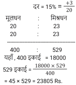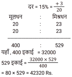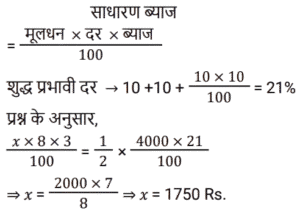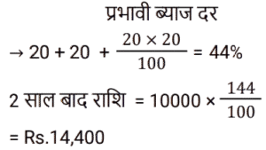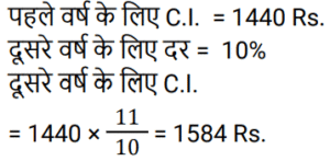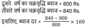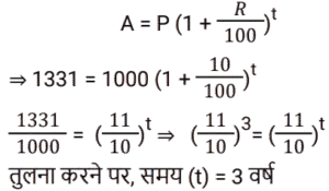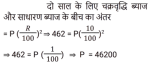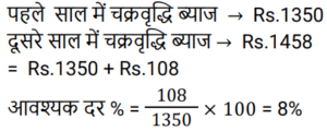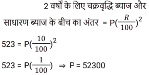 चक्रवृद्धि ब्याज Part-4Total Questions: 231. कितने समय में ₹.1000 की राशि 10% वार्षिक चक्रवृद्धि ब्याज की दर पर ₹.1331 हो जाएगी ? [RRB JE 27/06/2019 (Morning)](a) 4 वर्ष (b) 3 वर्ष(c) 2 वर्ष (d) 5 वर्षCorrect Answer: (b) 3 वर्षSolution:2. ₹‘x’ की राशि पर 8% की दर से 3 वर्ष का साधारण ब्याज, ₹.4000 की राशि पर 10% की दर से 2 वर्ष के चक्रवृद्धि ब्याज के आधे के बराबर है। ‘x’ का मान ज्ञात कीजिए। [RRB JE 28/06/2019 (Evening)](a) ₹.1750 (b) ₹.6000(c) ₹.1520 (d) ₹.1400Correct Answer: (a) ₹.1750 Solution:3. एक निश्चित राशि के लिए, दूसरे वर्ष के लिए चक्रवृद्धि ब्याज 800 ₹ और तीसरे वर्ष के लिए 840 रुपये है। तो ब्याज दर है: [ALP Tier II 21/01/2019 (Evening)](a) 6%(b) 5%(c) 7%(d) 4%Correct Answer: (b) 5%Solution:4. एक बैंक में ₹ 10000 की राशि जमा की गई जो 20% वार्षिक चक्रवृद्धि ब्याज प्रदान करती है। 2 साल बाद बैंक में कितनी राशि होगी? [ALP Tier II 21/01/2019 (Evening)](a) ₹ 12000 (b) ₹ 13600 (c) ₹ 14400(d) ₹ 8000Correct Answer: (c) ₹ 14400Solution:5. किसी मूलधन पर पहले और दूसरे साल के अंत में चक्रवृद्धि ब्याज पर प्राप्त राशि क्रमशः ₹ 1,350 और ₹ 1,458 है, तो ब्याज दर क्या है ? [ALP Tier II 23/01/2019 (Morning)](a) 12% (b) 8%(c) 15% (d) 10%Correct Answer: (b) 8%Solution:6. यदि पहले वर्ष में एक निश्चित राशि पर प्राप्त चक्रवृद्धि ब्याज ₹ 1,440 है, तो उसी मूलधन पर 10% ब्याज की दर पर दूसरे वर्ष के लिए चक्रवृद्धि ब्याज कितना होगा? [ALP Tier II 23/01/2019 (Afternoon)](a) ₹ 1,584 (b) ₹ 1,554(c) ₹ 1,512 (d) ₹ 1,540Correct Answer: (a) ₹ 1,584 Solution:7. 15% प्रति वर्ष की वार्षिक चक्रवृद्धि ब्याज दर (रुपये में) के साथ, 18000 रुपये की राशि पर 2 वर्ष की अवधि के बाद प्राप्त राशि है :- [RPF Constable 17/01/2019 (Morning)](a) 24805 (b) 23805(c) 25805 (d) 22805Correct Answer: (b) 23805Solution:8. एक निश्चित राशि पर दो साल बाद 10% प्रति वर्ष की दर से चक्रवृद्धि ब्याज और साधारण ब्याज के बीच का अंतर 462 रुपये है। निवेश की गई राशि ज्ञात कीजिए। [RPF Constable 18/01/2019 (Morning)](a) Rs.42,600 (b) Rs.26,400(c) Rs.24,600 (d) Rs.46,200Correct Answer: (d) Rs.46,200Solution:9. वह राशि ज्ञात कीजिए, जब 32000 रुपये की राशि को 15% वार्षिक दर से 2 वर्ष की अवधि के लिए वार्षिक रूप से संयोजित किया जाता है। [RPF Constable 18/01/2019 (Afternoon)](a) 43320 (b) 45320 (c) 44320 (d) 42320Correct Answer: (d) 42320Solution:10. एक निश्चित राशि पर प्रति वर्ष 10% की दर से 2 वर्ष बाद चक्रवृद्धि ब्याज और साधारण ब्याज के बीच का अंतर 523 रुपये है। निवेश की गई राशि ज्ञात कीजिए। [RPF Constable 19/01/2019 (Morning)](a) 52300 रुपये (b) 42300 रुपये(c) 62300 रुपये (d) 72300 रुपयेCorrect Answer: (a) 52300 रुपये Solution:Submit Quiz123Next »
