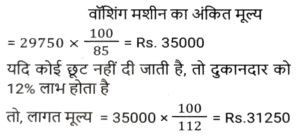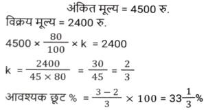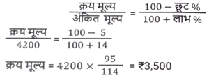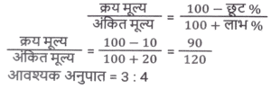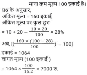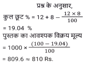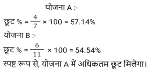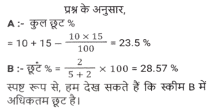 छूट/बट्टा (SSC) (Part-III)Total Questions: 5031. यदि एक बिजली के बिल का भुगतान नियत तारीख से पहले किया जाता है, तो बिल की राशि पर 13% की छूट मिलती है। नियत तारीख से पहले बिल का भुगतान करने पर, रवि को ₹260.39 की छूट मिली। उसके बिजली के बिल की राशि (₹ में) क्या थी ? [SSC CHSL 17/08/2023 (4th Shift)](a) 2,003(b) 2,580(c) 2,230(d) 2,064Correct Answer: (a) 2,003Solution:32. एक दुकानदार नीचे दी गई दो छूट संबंधी योजनाओं की पेशकश करता है। [SSC CGL 14/07/2023 (1st shift)]A) 3 वस्तुओं की खरीद पर 4 वस्तु मुफ्त पाएं। B) 5 वस्तुओं की खरीद पर 6 वस्तु मुफ्त पाएं। किस योजना में छूट प्रतिशत अधिकतम है?(a) A(b) योजना A में कोई छूट नहीं दी गई है(c) A और B दोनों योजनाओं में छूट प्रतिशत समान है।(d) BCorrect Answer: (a) ASolution:33. 15% की छूट देने के बाद, एक वाशिंग मशीन का मूल्य ₹29,750 है। यदि कोई छूट नहीं दी जाती है, तो दुकानदार को 12% का लाभ होता है। वाशिंग मशीन का क्रय मूल्य ज्ञात करें। [SSC CGL 17/07/2023 (3rd shift)](a) ₹ 31,250(b) ₹31,500(c) ₹ 31,750(d) ₹32,000Correct Answer: (a) ₹ 31,250Solution:34. एक दुकानदार नीचे दी गई दो छूट संबंधी योजनाओं की पेशकश करता है। [SSC CGL 18/07/2023 (1st shift)]A) 10% और 15% की दो क्रमिक छूट। B) 5 वस्तुओं की खरीद पर 2 वस्तु मुफ्त पाएं। किस योजना में छूट प्रतिशत अधिकतम है?(a) योजना B में कोई छूट नहीं दी गई है।(b) B(c) A और B दोनों योजनाओं में छूट प्रतिशत समान है।(d) ACorrect Answer: (b) BSolution:35. ₹10,000 मूल्य की वस्तुएं खरीदने पर एक दुकानदार अपने ग्राहकों को ₹500 की फ्लैट छूट प्रदान करता है। इसके अलावा, क्रेडिट कार्ड का उपयोग करके खरीदारी करने पर, वह 7% की अतिरिक्त छूट देता है। यदि कोई ग्राहक क्रेडिट कार्ड का उपयोग कर ₹10000 का सामान खरीदता है, तो उसे कितना भुगतान करना होगा ? [SSC CGL 18/07/2023 (1st shift)](a) ₹8,835(b) ₹9,000(c) ₹8,815(d) ₹9,300Correct Answer: (a) ₹8,835Solution:36. एक सीलिंग फैन का अंकित मूल्य ₹4,200 है और दुकानदार इस पर 5% की छूट देता है। यदि उसका लाभ 14% है, तो पंखे का क्रय मूल्य __________ है। [SSC CGL 18/07/2023 (3rd shift)](a) ₹3,200(b) ₹3,800(c) ₹3,000(d) ₹3,500Correct Answer: (d) ₹3,500Solution:37. एक पुस्तक पर अंकित मूल्य ₹1,000 है। एक पुस्तक मेले में, यह 12% और 8% की दो क्रमिक छूट देने वाली छूट योजना के साथ बिक्री के लिए उपलब्ध है। एक ग्राहक के लिए पुस्तक का अंतिम विक्रय मूल्य (₹ में) क्या होगा (निकटतम पूर्णांक तक पूर्णांकित करें)? [SSC CGL 18/07/2023 (4th shift)](a) 810(b) 790(c) 825(d) 800Correct Answer: (a) 810Solution:38. एक दुकानदार अपने माल के मुद्रित मूल्य पर 10% छूट प्रदान करता है और इस प्रकार 20% का लाभ अर्जित करता है। वस्तु के क्रय मूल्य और मुद्रित मूल्य के बीच का अनुपात क्या है ? [SSC CGL 19/07/2023 (2nd shift)](a) 3 : 4(b) 2 : 3(c) 4 : 5(d) 1 : 2Correct Answer: (a) 3 : 4Solution:39. एक डीलर एक वस्तु पर क्रय मूल्य से 60% अधिक मूल्य अंकित करता है और उस अंकित मूल्य पर 10% और 20% की दो क्रमिक छूटें देकर एक ग्राहक को बेचता है। यदि उसे लेन-देन में ₹1,064 का लाभ होता है, तो वस्तु का क्रय मूल्य (₹ में) ज्ञात करें। [SSC CGL 19/07/2023 (4th shift)](a) 8400(b) 7000(c) 6300(d) 7200Correct Answer: (b) 7000Solution:40. एक फ्रॉक का अंकित मूल्य ₹4,500 है। इसे दो क्रमिक छूटों पर ₹2,400 में बेचा जाना है। यदि पहली छूट 2