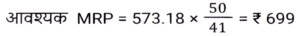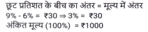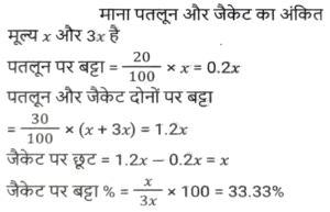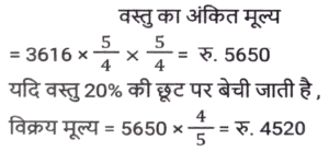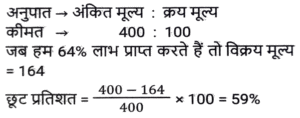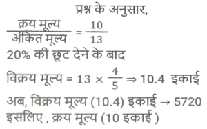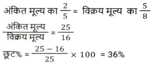 छूट/बट्टा (SSC) (Part-IV)Total Questions: 5021. एक कलम का अंकित मूल्य Rs.5000 है। दुकानदार ग्राहक को 15 प्रतिशत और b प्रतिशत के दो क्रमागत छूट देता है। यदि ग्राहक कलम के लिए Rs.4080 का भुगतान करता है, तो b का मान क्या है ? [SSC MTS 13/06/2023 (Morning)](a) 3%(b) 5%(c) 7.5%(d) 4%Correct Answer: (d) 4%Solution:22. एक वस्तु को 20 प्रतिशत और 20 प्रतिशत के दो क्रमागत बट्टों पर बेचा जाता है। दूसरे बट्टे के बाद वस्तु का विक्रय मूल्य Rs. 3616 है। यदि इसे 20 प्रतिशत के केवल एक बट्टे पर बेचा जाए, तो वस्तु का विक्रय मूल्य क्या होगा ? [SSC MTS 19/06/2023 (Morning)](a) Rs.3960(b) Rs.4520(c) Rs 4080(d) Rs.5200Correct Answer: (b) Rs.4520Solution:23. सपना ने एक सेल में Rs. 573.18 की एक किताब खरीदी, उसे MRP पर 18% की छूट मिली। किताब की MRP क्या है ? [SSC MTS 20/06/2023 (Morning)](a) Rs.649(b) Rs.699(c) Rs.749(d) Rs.799Correct Answer: (b) Rs.699Solution:24. अंकित मूल्य का 2/5 भाग विक्रय मूल्य के 5/8 भाग के बराबर है। छूट प्रतिशत क्या है ? [SSC CHSL 09/03/2023 (1st Shift)](a) 40%(b) 42%(c) 36%(d) 50%Correct Answer: (c) 36%Solution:25. वस्तु A पर 20 प्रतिशत का बट्टा वस्तु B पर 15 प्रतिशत बट्टे के बराबर है। वस्तु A और B के अंकित मूल्य का अनुपात क्या है ? [SSC CHSL 13/03/2023 (2nd Shift)](a) 3 : 4(b) 6 : 7(c) 7 : 8(d) 6 : 11Correct Answer: (a) 3 : 4Solution:26. एक पाजामे का अंकित मूल्य क्रय मूल्य का चार गुना है। 64 प्रतिशत लाभ अर्जित करने के लिए छूट प्रतिशत कितना होना चाहिए ? [SSC CHSL 15/03/2023 (2nd Shift)](a) 55%(b) 62%(c) 65%(d) 59%Correct Answer: (d) 59%Solution:27. एक पतलून और एक जैकेट का अंकित मूल्य 1 : 3 के अनुपात में है। दुकानदार पतलून पर 20 प्रतिशत का बट्टा देता है। यदि उन दोनों पर दिया गया कुल बट्टा 30 प्रतिशत है, तो जैकेट पर कितने प्रतिशत बट्टा दिया गया ? [SSC CHSL 16/03/2023 (1st Shift)](a) 28.56%(b) 41.25%(c) 33.33%(d) 16.66%Correct Answer: (c) 33.33%Solution:28. निखिल अपनी पत्नी के लिए हीरे की अंगूठी खरीदता है। हीरे की अंगूठी का अंकित मूल्य Rs. 20,000 है और इसकी कीमत में दो क्रमागत बट्टे दिए जाते हैं, जो क्रमशः 25% और x% हैं। यदि दोनों बट्टों के बाद उसे खरीदने के लिए Rs. 12,000 का भुगतान किया जाता है, तो x का मान ज्ञात करें। [SSC CHSL 16/03/2023 (2nd Shift)](a) 40%(b) 10%(c) 20%(d) 35%Correct Answer: (c) 20%Solution:29. पीयूष अपनी वस्तु का मूल्य उसके क्रय मूल्य से 30 प्रतिशत अधिक अंकित करता है। यदि वह 20 प्रतिशत की छूट देकर वस्तु को Rs. 5720 में बेचता है, तो वस्तु का क्रय मूल्य क्या होगा ? [SSC CHSL 17/03/2023 (3rd Shift)](a) Rs.5000(b) Rs.5350(c) Rs.5200(d) Rs.5500Correct Answer: (d) Rs.5500Solution:30. एक विक्रेता एक घड़ी पर 9% बट्टा देता है। यदि वह 6% बट्टा देता है, तो वह Rs 30 अधिक लाभ अर्जित करता है। अंकित मूल्य कितना है ? [SSC CHSL 20/03/2023 (2nd Shift)](a) Rs.900(b) Rs.1,400(c) Rs.1,000(d) Rs.1,300Correct Answer: (c) Rs.1,000Solution:Submit Quiz« Previous12345Next »