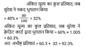 18. एक सेल ऑफर में, सुरेश को अंकित मूल्य के उस हिस्से पर 20% की छूट की पेशकश की गई जिसका भुगतान नकद में किया गया था, लेकिन क्रेडिट कार्ड के माध्यम से भुगतान किए गए अंकित मूल्य के हिस्से पर 0.5% शुल्क लिया गया था। यदि सुरेश ने अंकित मूल्य का 40% नकद में और शेष क्रेडिट कार्ड से दिया, तो उसका कुल अंतिम भुगतान, अंकित मूल्य का कितना प्रतिशत था ? [SSC CHSL 07/06/2022 (Evening)]