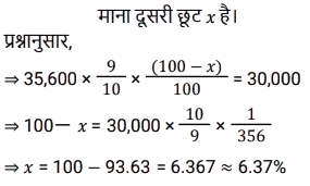 11. एक मोबाइल फोन का अंकित मूल्य ₹35,600 था। दुकान के मालिक ने अंकित मूल्य पर 10% व्यापारिक छूट की पेशकश की, लेकिन ग्राहक के और अनुरोध करने पर उसने नकद छूट देकर ₹30,000 में फोन बेच दिया। व्यापारिक छूट के बाद दी गई नकद छूट प्रतिशत में (दशमलव के 2 स्थानों तक पूर्णांकित) कितनी है ? [SSC CHSL 01/06/2022 (Morning)]