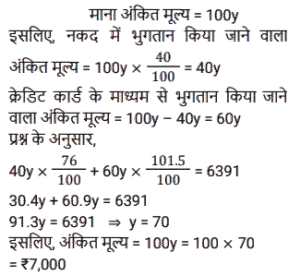 12. एक वस्तु पर एक सेल ऑफर में, महेश को अंकित मूल्य के उस हिस्से पर 24% छूट की पेशकश की गई जिसका भुगतान नकद में किया गया था, लेकिन क्रेडिट कार्ड के माध्यम से भुगतान किए गए अंकित मूल्य के हिस्से पर 1.5% का शुल्क लगाया गया। यदि महेश ने अंकित मूल्य का 40% नकद में और शेष क्रेडिट कार्ड के माध्यम से भुगतान किया और उसका कुल अंतिम भुगतान ₹6,391 था, तो वस्तु का अंकित मूल्य क्या था ? [SSC CHSL 01/06/2022 (Afternoon)]