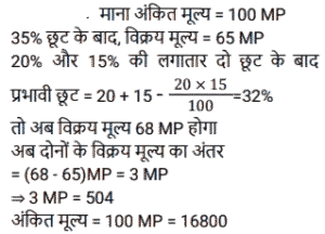 छूट/बट्टा (SSC) (Part-V)Total Questions: 6161. अंकित मूल्य पर, 35% की छूट और 20% और 15% के दो क्रमिक छूटों के साथ विक्रय मूल्यों का अंतर 504 रुपये है। वस्तु का अंकित मूल्य (रुपये में) है: [SSC CPO 25/11/2020 (Evening)](a) 18,000(b) 16,800(c) 16,000(d) 15,500Correct Answer: (b) 16,800Solution:Submit Quiz« Previous1234567