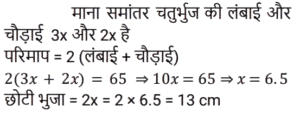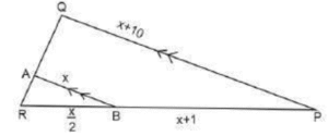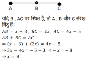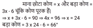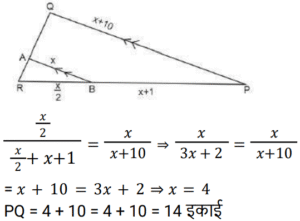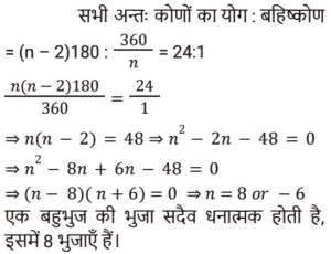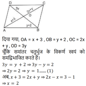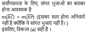 ज्यामितिTotal Questions: 501. x का मान ज्ञात कीजिए यदि ABCD एक समांतर चतुर्भुज है जैसा कि नीचे दिए गए चित्र में दिया गया है, जिसमें दो विकर्ण AC और BD, O पर प्रतिच्छेद करते हैं और OA = x + 3, OB = y + 2, OC = 2x + y, OD = 3y [Group D 17/08/2022 (Morning)](a) 2(b) 3(c) 4(d) 1Correct Answer: (a) 2Solution:2. जब दो तिर्यक रेखाएं, तीन समानांतर रेखाओं को प्रतिच्छेद करती हैं, और पहली तिर्यक रेखा द्वारा निर्मित अंतः खंडों का अनुपात 3 : 4 है, तो दूसरी तिर्यक रेखा द्वारा निर्मित अंतः खंडों का अनुपात ज्ञात कीजिए। [Group D 17/08/2022 (Afternoon)](a) 1 : 1(b) 4 : 3(c) 3 : 4(d) 2 : 4Correct Answer: (c) 3 : 4Solution:3. दी गई आकृति में ∠ABC = ∠ABD, BC = BD तो ΔCAB ≅ Δ……. [Group D 17/08/2022 (Evening)](a) DBA(b) DAB(c) ADB(d) ABDCorrect Answer: (b) DABSolution:4. दी गई आकृति में, AB ∥ QP, AB = x, PQ = x + 10, RB = x/2, BP = x + 1 PQ का मान ज्ञात कीजिए। [Group D 18/08/2022 (Morning)](a) 13 इकाई(b) 18 इकाई(c) 12 इकाई(d) 14 इकाईCorrect Answer: (d) 14 इकाईSolution:5. दो कोण पूरक हैं। बड़ा कोण छोटे कोण के माप के तीन गुना से 6° कम है। तो बड़े कोण का माप क्या है? [Group D 18/08/2022 (Afternoon)](a) 66°(b) 54°(c) 63°(d) 57°Correct Answer: (a) 66°Solution:6. यदि AB = x + 3, BC = 2x और AC = 4x − 5, तो ‘x’ के किस मान के लिए B, AC पर स्थित होगा? [Group D 18/08/2022 (Afternoon)](a) 2(b) 5(c) 8(d) 3Correct Answer: (c) 8Solution:7. निम्नलिखित में से कौनसा कथन सत्य नहीं है? [Group D 22/08/2022 (Afternoon)](a) सभी आयत समांतर चतुर्भुज होते हैं।(b) आयत के विकर्ण एक दूसरे को समद्विभाजित नहीं करते।(c) आयत की सममुख भुजाएं सर्वांगसम और समानांतर होती हैं।(d) आयत के आसन्न कोणों के किसी भी युग्म का योग 180° होता है।Correct Answer: (b) आयत के विकर्ण एक दूसरे को समद्विभाजित नहीं करते।Solution:8. एक समांतर चतुर्भुज में दो आसन्न भुजाएं 3 : 2 के अनुपात में हैं और उसका परिमाप 65 cm है। इस समांतर चतुर्भुज की दो छोटी भुजाओं में से प्रत्येक की लंबाई क्या है? [Group D 23/08/2022 (Evening)](a) 19 cm(b) 13 cm(c) 18 cm(d) 21 cmCorrect Answer: (b) 13 cmSolution:9. एक समबहुभुज के सभी अंतः कोणों के योग और एक बाह्य कोण के माप का अनुपात 24 : 1 है। बहुभुज की भुजाओं की संख्या ज्ञात कीजिए। [Group D 25/08/2022 (Afternoon)](a) 80(b) 10(c) 78(d) 8Correct Answer: (d) 8Solution:10. If ΔABC ≅ ΔPQR, निम्नलिखित में से किस विकल्प का सत्य होना अनिवार्य नहीं है? [Group D 26/08/2022 (Morning)](a)(b)(c)(d)Correct Answer: (a)Solution:Submit Quiz12345Next »