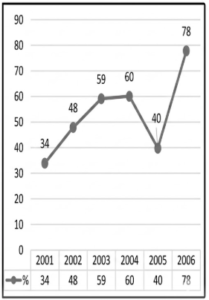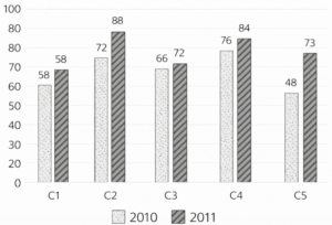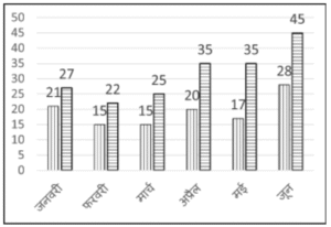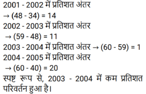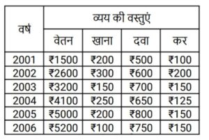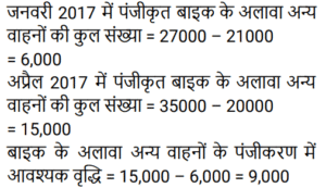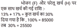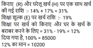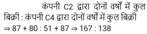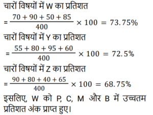 डेटा इंटरप्रिटेशन (D.I)Total Questions: 5041. नोट: निम्नलिखित पंक्तियाँ छह साल की अवधि 2001 से 2006 के दौरान उपस्थित उम्मीदवारों की कुल संख्या की तुलना में परीक्षा में योग्य उम्मीदवारों की संख्या का प्रतिशत दर्शाती हैं। [RPF Constable 17/01/2019 (Morning)]नीचे दिए गए वर्षों की किस जोड़ी में योग्य उम्मीदवारों के प्रतिशत में कम अंतर था?(a) 2003 – 2004(b) 2004 – 2005(c) 2002 – 2003(d) 2001 – 2002Correct Answer: (a) 2003 – 2004Solution:42. निर्देश: निम्नलिखित बार ग्राफ़ का अध्ययन करें और निम्नलिखित प्रश्नों का उत्तर दें। कुल व्यय (100%): ₹85,000 भोजन (F) और घरेलू खर्च (H) पर एक साथ खर्च की गई राशि ज्ञात कीजिए। [RPF Constable 18/01/2019 (Morning)](a) ₹24,400(b) ₹23,300(c) ₹22,200(d) ₹25,500Correct Answer: (d) ₹25,500Solution:43. निर्देश: निम्नलिखित बार ग्राफ़ का अध्ययन करें और निम्नलिखित प्रश्नों का उत्तर दें। कुल व्यय (100%): ₹85,000 शिक्षा शुल्क में कितना और पैसा जोड़ा जाना चाहिए ताकि यह किराया (R) और घरेलू खर्च (H) पर खर्च की गई राशि के बराबर हो जाए? [RPF Constable 18/01/2019 (Morning)](a) ₹10,800(b) ₹9,600(c) ₹10,200(d) ₹10,600Correct Answer: (c) ₹10,200Solution:44. निर्देश: निम्न बार ग्राफ़ का अध्ययन कीजिए और उसके आधार पर प्रश्न का उत्तर दीजिए। एक पब्लिशिंग कंपनी की पाँच शाखाओं (C1, C2, C3, C4 और C5) की दो क्रमागत वर्षों 2010 और 2011 में हुई पुस्तकों की बिक्री (हज़ार में) दी गई है। वर्ष 2010 में सभी शाखाओं की बिक्री का औसत (हज़ार में) ज्ञात कीजिए। [RPF S.I. 19/12/2018 (Morning)](a) 65(b) 64(c) 63(d) 66Correct Answer: (b) 64Solution:45. निर्देश : निम्न बार ग्राफ का अध्ययन कीजिए और उसके आधार पर प्रश्न का उत्तर दीजिए? एक पब्लिशिंग कंपनी की पाँच शाखाओं (C1, C2, C3, C4 और C5) की दो क्रमागत वर्षों 2010 और 2011 में हुई पुस्तकों की बिक्री (हजार में) दी गयी है। दोनों वर्षों में कंपनी की शाखाओं C1, C3 और C5 की एकसाथ कुल बिक्री (हजार में) ज्ञात कीजिए? [RPF S.I. 19/12/2018 (Morning)](a) 355(b) 365(c) 375(d) 385Correct Answer: (d) 385Solution:46. निर्देश : निम्न बार ग्राफ का अध्ययन कीजिए और उसके आधार पर प्रश्न का उत्तर दीजिए? एक पब्लिशिंग कंपनी की पाँच शाखाओं (C1, C2, C3, C4 और C5) की दो क्रमागत वर्षों 2010 और 2011 में हुई पुस्तकों की बिक्री (हजार में) दी गयी है। शाखा C2 की दोनों वर्षों में हुई कुल बिक्री और शाखा C4 की दोनों वर्षों में हुई कुल बिक्री का अनुपात ज्ञात कीजिए? [RPF S.I. 19/12/2018 (Evening)](a) 8 : 9(b) 7 : 8(c) 8 : 7(d) 9 : 8Correct Answer: (c) 8 : 7Solution:47. निर्देश : निम्न बार ग्राफ का अध्ययन कीजिए और उसके आधार पर प्रश्न का उत्तर दीजिए? एक पब्लिशिंग कंपनी की पाँच शाखाओं (C1, C2, C3, C4 और C5) की दो क्रमागत वर्षों 2010 और 2011 में हुई पुस्तकों की बिक्री (हजार में) दी गयी है। [RPF S.I. 24/12/2018 (Morning)]शाखा C2 की दोनों वर्षों में हुई कुल बिक्री और शाखा C4 की दोनों वर्षों में हुई कुल बिक्री का अनुपात ज्ञात कीजिए?(a) 196 : 123(b) 123 : 196(c) 167 : 138(d) 138 : 167Correct Answer: (c) 167 : 138Solution:48. जनवरी – फरवरी – मार्च – अप्रैल – मई – जून दिए गए आंकड़े मोटर साइकिल और कुल गाड़ियों के 2017 के शुरुआती 6 महीनों में शहर X में हुए पंजीकरणों की संख्या (हजारों में) बताते हैं। सूचना: च