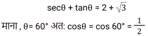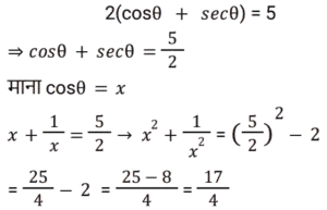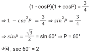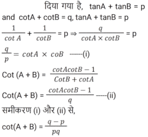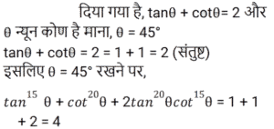 त्रिकोणमिति Part-5Total Questions: 5031. यदि 3tanθ = 2, तो निम्नलिखित का मान क्या होगा? [RRB NTPC 05/04/2021 (Evening)](a) 1/√13 (b) 2/√13(c) 2/13 (d) 3/13Correct Answer: (b) 2/√13Solution:32. यदि cos⁴θ – sin⁴θ = 3/5, तो निम्नलिखित का मान क्या होगा ? [RRB NTPC 05/04/2021 (Evening)]1 – 2sin²θ + 2sinθcosθ(a) 0 (b) 5/6 (c) 6/5(d) 8/5Correct Answer: (c) 6/5Solution:33. यदि θ एक न्यून कोण है और tanθ + cotθ = 2 है, तो निम्नलिखित का मान क्या होगा? [RRB NTPC 05/04/2021 (Evening)]tan¹⁵θ + cot²⁰θ + 2tan²⁰θ cot¹⁵θ(a) 4 (b) 3 (c) 5 (d) 6Correct Answer: (a) 4 Solution:34. अगर tanA + tanB = p तथा cotA + cotB = q, फिर cot(A + B) है : [RRB NTPC 07/04/2021 (Morning)](a) (p – q) / pq(b) (q – p) / pq(c) pq / (p – q)(d) pq / (p + q)Correct Answer: (b) (q – p) / pqSolution:35. cos23° + cos24° + cos25° + …… + cos87° का मान है : [RRB NTPC 08/04/2021 (Morning)](a) 55/2 (b) 65/2 (c) 75/2 (d) 85/2Correct Answer: (d) 85/2Solution:36. यदि (1 – cosP)(1 + cosP) = 3/4 तथा P एक न्यून कोण है, तो secP का मान ज्ञात कीजिए। [RRB NTPC 23/07/2021 (Morning)](a) √7/2 (b) 1/2 (c) 2(d) √2/7Correct Answer: (c) 2Solution:37. यदि 2(cosθ + secθ) = 5, sec²θ + cos²θ का मान क्या है? [RRB NTPC 23/07/2021 (Evening)](a) 4/17 (b) 25/4 (c) 17/4(d) 4/4Correct Answer: (c) 17/4Solution:38. यदि x = 3cosAcosB, y = 3cosAsinB और z = 3sinA, x² + y² + z² का मान ज्ञात कीजिए। [RRB NTPC 23/07/2021 (Evening)](a) 6 (b) 3 (c) 12 (d) 9Correct Answer: (d) 9Solution:39. sin²5° + sin²10° + sin²80° + sin²85° का मान क्या है ? [RRB NTPC 23/07/2021 (Evening)](a) 0 (b) 2(c) 1 (d) 3Correct Answer: (b) 2Solution:40. यदि secθ + tanθ = 2 + √3 , तो cosθ = ? [RRB NTPC 24/07/2021 (Morning)](a) √3 (b) 2 (c) 1/2(d) √3/2Correct Answer: (c) 1/2Solution:Submit Quiz« Previous12345Next »