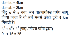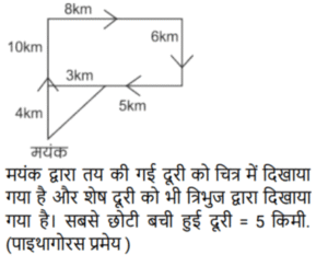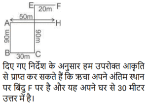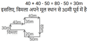 दिशाएं (भाग-II)Total Questions: 4031. एक किसान अपने खेत को तैयार कर रहा है। वह अपने ट्रेक्टर को गैरेज से निकालता है और पूरब की तरफ 5 किमी चलाता है। वहां से वह दायें मुड़ता है तथा 6 किमी जाता है। फिर वह दायें मुड़ता है और 8 किमी जाता है। फिर से वह दायें मुड़ता है एवं 10 किमी जाता है जहाँ उसका ट्रेक्टर रुक जाता है। उसके वर्तमान स्थान एवं गैरेज के बीच न्यूनतम दूरी कितनी है ? [SSC CPO 09/12/2019 (Morning)](a) 9 km(b) 6 km(c) 5 km(d) 2 kmCorrect Answer: (c) 5 kmSolution:32. सत्यम उत्तर की ओर चलना शुरू करता है। 70 मी चलने के बाद वह बाएं मुड़ता है और 35 मी सीधे चलता है। फिर वह बाएं मुड़ता है और 30 मी चलता है, पुनः वह बाएं मुड़ता है और 35 मी की दूरी तय करता है। वह आरंभिक बिंदु से कितनी दूर और किस दिशा में है ? [SSC CPO 09/12/2019 (Morning)](a) 40 मी, दक्षिण(b) 35 मी, उत्तर(c) 35 मी, दक्षिण(d) 40 मी, उत्तरCorrect Answer: (d) 40 मी, उत्तरSolution:स्पष्ट रूप से जब सत्येन बिंदु 1 से 5 तक यात्रा करता है जैसा कि चित्र में दिखाया गया है कि उसका मुख बिंदु 1 से 40 मीटर उत्तर दिशा की ओर है।33. एक बस चालक बिंदु A से चला और पूर्व की तरफ 25 किमी गया। वह बाएं मुड़ा और 30 किमी चला। इसके बाद वह बाएं मुड़ा एवं 15 किमी गया। वह फिर से बाएं मुड़ा और 30 किमी बस चलाकर बिंदु B पर पहुंचा। बिंदु B बिंदु A से कितनी दूरी पर एवं किस दिशा में है ? [SSC CPO 09/12/2019 (Evening)](a) 40 km, पूर्व(b) 40 km, पश्चिम(c) 10 km, पश्चिम(d) 10 km, पूर्वCorrect Answer: (d) 10 km, पूर्वSolution:34. ऋचा अपने घर से चलना शुरू करती है तथा पश्चिम की तरफ 50 मीटर चलती है और फिर बाएं मुड़कर 90 मी चलती है। तब वह फिर से बाएं मुड़ती है एवं 30 मी चलती है। इसके बाद वह फिर से बाएं मुड़ती है एवं 120 मी चलती है। वह अंततः दायें मुड़ती है और 20 मी चलकर अपने गंतव्य स्थल पर पहुँचती है। अभी वह अपने घर से कितनी दूरी पर है तथा वह अपने घर से किस दिशा में है ? [SSC CPO 11/12/2019 (Morning)](a) 40m, उत्तर-पश्चिम(b) 30m, दक्षिण(c) 40m, उत्तर-पूर्व(d) 30m, उत्तरCorrect Answer: (d) 30m, उत्तरSolution:35. ऋषभ पश्चिम की तरफ चलना शुरू करता है। 70 मीटर चलने के बाद वह बाएं को मुड़ता है और 35 मीटर सीधा चलता है। वह पुनः बाएं मुड़ता है एवं 30 मीटर चलता है, फिर से बाएं मुड़ता है और 35 मीटर चलता है। आरंभिक बिंदु से वह कितनी दूरी पर है ? [SSC CPO 11/12/2019 (Evening)](a) 60 m(b) 100 m(c) 70 m(d) 40 mCorrect Answer: (d) 40 mSolution:36. मयंक अपने कार्यालय से होटल की ओर चला । उसने उत्तर में 10 किमी वाहन चलाया। वहां से, वह दायें मुड़ा और 8 किमी गया। फिर वह दायें मुड़ा और 6 किमी चला। फिर से, वह दायें मुड़ा और 5 किमी जाकर अपने होटल पहुँच गया। उसके कार्यालय से होटल की सबसे छोटी दूरी कौन सी है ? [SSC CPO 11/12/2019 (Evening)](a) 5 km(b) 9 km(c) 2 km(d) 6 kmCorrect Answer: (a) 5 kmSolution:37. अमीता उत्तर की ओर 20 मीटर चलती है और फिर दाईं ओर मुड़ता है और 30 मीटर है। फिर वह बाएं मुड़ती है और 25 मी चलती है। उसके बाद वह दाएं मुड़ती है और 30 मी चलती है। वहां से, वह दाएं मुड़ती है और 65 मीटर चलती है। फिर वह फिर से बाएं मुड़ती है और 40 मीटर चलती है। वह अंतत