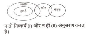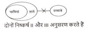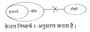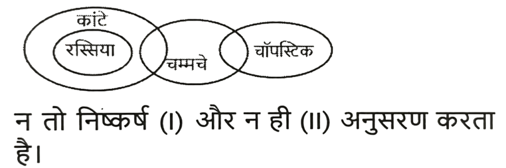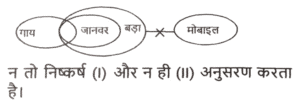 न्यायवाक्य (भाग-IV)Total Questions: 5031. दिए गए निष्कर्षों में से कौन सा कथन से तार्किक रूप से अनुसरण करता है। [SSC CPO 04/10/2023 (2nd Shift)]कथन : कुछ सेब संतरे हैं। सभी संतरे फल हैं। निष्कर्ष : I) सभी सेब फल हैं। II) कुछ फल संतरे हैं।(a) न तो निष्कर्ष। और न ही निष्कर्ष ॥ पालन करता है।(b) केवल निष्कर्ष ॥ पालन करता है।(c) निष्कर्ष । और ।। दोनों पालन करते हैं।(d) केवल निष्कर्ष । पालन करता है।Correct Answer: (b) केवल निष्कर्ष ॥ पालन करता है।Solution:32. दिए गए निष्कर्षों में से कौन सा कथन से तार्किक रूप से अनुसरण करता है। [SSC CPO 05/10/2023 (1st Shift)]कथन : कुछ खजूर हेज़लनट हैं। सभी हेज़लनट अखरोट हैं। निष्कर्ष : I. कुछ खजूर अखरोट हैं। II. कुछ अखरोट हेज़लनट हैं।(a) न तो निष्कर्ष। और न ही निष्कर्ष ॥ पालन करता है।(c) दोनों निष्कर्ष पालन करते हैं।(c) दोनों निष्कर्ष पालन करते हैं।(d) केवल निष्कर्ष। पालन करता है।Correct Answer: (c) दोनों निष्कर्ष पालन करते हैं।Solution:33. दिए गए निष्कर्षों में से कौन सा कथन से तार्किक रूप से अनुसरण करता है। [SSC CPO 05/10/2023 (3rd Shift)]कथन : सभी चाबियां ताले हैं। कोई दरवाजा ताला नहीं है। निष्कर्ष : I. कुछ ताले दरवाजे हैं। ।।. कुछ ताले चाबियां हैं। III. कोई भी चाबी दरवाजा नहीं है।(a) निष्कर्ष। और ।। दोनों पालन करते हैं।(b) निष्कर्ष। और ।।। दोनों पालन करते हैं।(c) निष्कर्ष ॥ और ।।। दोनों पालन करते हैं।(d) निष्कर्ष ।, ।। और ।।। पालन करते हैं।Correct Answer: (c) निष्कर्ष ॥ और ।।। दोनों पालन करते हैं।Solution:34. दिए गए निष्कर्षों में से कौन सा कथन से तार्किक रूप से अनुसरण करता है। [SSC MTS 01/09/2023 (1st Shift)]कथन : सभी टुकड़े, कालीन है। कुछ कालीन, स्टील है। कुछ स्टील, बोतलें हैं। निष्कर्ष : (I) सभी कालीन, टुकड़े हैं। (II) कुछ कालीन, बोतलें हैं।(a) केवल निष्कर्ष (I) कथनों के अनुसार है।(b) दोनों निष्कर्ष (I) और (II) कथनों के अनुसार हैं।(c) केवल निष्कर्ष (II) कथनों के अनुसार है।(d) न तो निष्कर्ष (I) और न ही (II) कथनों के अनुसार है।Correct Answer: (d) न तो निष्कर्ष (I) और न ही (II) कथनों के अनुसार है।Solution:35. दिए गए निष्कर्षों में से कौन सा कथन से तार्किक रूप से अनुसरण करता है। [SSC MTS 01/09/2023 (2nd Shift)]कथन : सभी टीवी, रेडियो हैं। कुछ रेडियो, ड्रायर हैं। सभी ड्रायर, गर्म हैं। निष्कर्ष : (I) कुछ टीवी, रेडियो हैं। (II) कुछ ड्रायर, टीवी हैं।(a) न तो निष्कर्ष (I) और न ही (II) कथनों के अनुसार है।(b) दोनों निष्कर्ष (I) और (II) कथनों के अनुसार हैं।(c) केवल निष्कर्ष (I) कथनों के अनुसार है।(d) केवल निष्कर्ष (II) कथनों के अनुसार है।Correct Answer: (c) केवल निष्कर्ष (I) कथनों के अनुसार है।Solution:36. दिए गए निष्कर्षों में से कौन सा कथन से तार्किक रूप से अनुसरण करता है। [SSC MTS 01/09/2023 (2nd Shift)]कथन : कुछ गाय, जानवर हैं। सभी जानवर बड़े, हैं। कोई बड़ा, मोबाइल नहीं है। निष्कर्ष : (I) सभी गाय, जानवर हैं। (II) कोई बड़ा, जानवर नहीं है।(a) केवल निष्कर्ष (I) कथनों के अनुसार है।(b) न तो निष्कर्ष (I) और न 