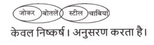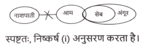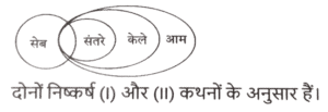 न्यायवाक्य (भाग-IV)Total Questions: 5041. दिए गए निष्कर्षों में से कौन सा कथन से तार्किक रूप से अनुसरण करता है। [SSC MTS 06/09/2023 (3rd Shift)]कथन : सभी फूल, नारंगी है। कुछ नारंगी, रंग है। सभी रंग, चमकीले हैं। निष्कर्ष : (I) कुछ नारंगी, फूल हैं। (II) सभी रंग, नारंगी है।(a) केवल निष्कर्ष (I) कथनों के अनुसार है।(b) दोनों निष्कर्ष (I) और (II) कथनों के अनुसार हैं।(c) केवल निष्कर्ष (II) कथनों के अनुसार है।(d) न तो निष्कर्ष (I) और न ही (II) कथनों के अनुसार है।Correct Answer: (a) केवल निष्कर्ष (I) कथनों के अनुसार है।Solution:42. दिए गए निष्कर्षों में से कौन सा कथन से तार्किक रूप से अनुसरण करता है। [SSC MTS 11/09/2023 (2nd Shift)]कथन : सभी जोकर, बोतलें हैं। कुछ बोतलें, स्टील है। सभी स्टील, चाबियां है। निष्कर्ष : (I) कुछ जोकर, बोतलें है। (II) सभी स्टील, बोतलें हैं।(a) दोनों निष्कर्ष (I) और (II) कथनों के अनुसार हैं।(b) केवल निष्कर्ष (I) कथनों के अनुसार है।(c) केवल निष्कर्ष (II) कथनों के अनुसार है।(d) न तो निष्कर्ष (I) और न ही (II) कथनों के अनुसार है।Correct Answer: (d) न तो निष्कर्ष (I) और न ही (II) कथनों के अनुसार है।Solution:43. दिए गए निष्कर्षों में से कौन सा कथन से तार्किक रूप से अनुसरण करता है। [SSC MTS 11/09/2023 (3rd Shift)]कथन : सभी पेड़, मोबाइल हैं। कुछ मोबाइल, छोटे हैं। सभी छोटे, चीटियां हैं। निष्कर्ष : (I) कुछ पेड़, मोबाइल है। (II) कुछ चीटियां, छोटे हैं।(a) केवल निष्कर्ष (II) कथनों के अनुसार है।(b) न तो निष्कर्ष (I) और न ही (II) कथनों के अनुसार है।(c) केवल निष्कर्ष (I) कथनों के अनुसार है।(d) दोनों निष्कर्ष (I) और (II) कथनों के अनुसार हैं।Correct Answer: (d) दोनों निष्कर्ष (I) और (II) कथनों के अनुसार हैं।Solution:44. दिए गए निष्कर्षों में से कौन सा कथन से तार्किक रूप से अनुसरण करता है। [SSC MTS 13/09/2023 (1st Shift)]कथन : कुछ पत्तियां, पुरानी हैं। सभी पुरानी, कपड़े हैं। कुछ कपड़े, कागज हैं। निष्कर्ष : (I) सभी पत्तियां, पुरानी हैं। (II) कुछ पुरानी, कपड़े हैं।(a) केवल निष्कर्ष (I) कथनों के अनुसार है।(b) दोनों निष्कर्ष (I) और (II) कथनों के अनुसार हैं।(c) केवल निष्कर्ष (II) कथनों के अनुसार है।(d) न तो निष्कर्ष (I) और न ही (II) कथनों के अनुसार है।Correct Answer: (c) केवल निष्कर्ष (II) कथनों के अनुसार है।Solution:45. दिए गए निष्कर्षों में से कौन सा कथन से तार्किक रूप से अनुसरण करता है। [SSC MTS 13/09/2023 (3rd Shift)]कथन : कुछ लैपटॉप, पेंसिलें हैं। कुछ पेंसिलें, रूलर हैं। सभी रूलर, सफ़ेद हैं। निष्कर्ष : (I) कुछ पेंसिलें, लैपटॉप हैं। (II) सभी रूलर, पेंसिलें हैं।(a) दोनों निष्कर्ष (I) और (II) कथनों के अनुसार हैं।(b) केवल निष्कर्ष (I) कथनों के अनुसार है।(c) न तो निष्कर्ष (I) और न ही (II) कथनों के अनुसार है।(d) केवल निष्कर्ष (II) कथनों के अनुसार है।Correct Answer: (b) केवल निष्कर्ष (I) कथनों के अनुसार है।Solution:46. दिए गए निष्कर्षों में से कौन सा कथन से तार्किक रूप से अनुसरण करता है। [SSC CHSL 02/08/2023 (2nd Shift)]कथन : कुछ आम सेब हैं। सभी सेब अंगूर हैं। कोई नाशपाती, आम नहीं है। नि