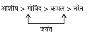 पदानुक्रम/व्यवस्थीकरण/समस्या समाधान Type-I (51 – 100 प्रश्न)Total Questions: 5031. एक खम्भा जिर्राफ से लम्बा है जो वृक्ष से लम्बा है। एक सिग्नल खम्भे से छोटा है परंतु एक भवन से लम्बा है जो जिर्राफ से लम्बा है। सुबसे छोटा कौन है ? [RRC NTPC ग्रैजुएट लेवल (CBT) परीक्षा, 30.03.2016, Shift-III](A) सिग्नल(B) जिर्राफ(C) वृक्ष(D) भवन(1) A(2) C(3) B(4) DCorrect Answer: (2) CSolution:खम्भा > जिर्राफ > वृक्षखम्भा > सिग्नल > भवन > जिर्राफखम्भा > सिग्नल > भवन > जिर्राफ > वृक्ष32. राम गीता से लंबा है। विमला राम से लंबी ...है लेकिन मीनू से छोटी है। बिन्दू गीता से लम्बी है लेकिन राम से छोटी है। दिए गए लोगों मेंसे सबसे छोटा कौन है? [RRB NTPC ग्रैजुएट लेबल CBT (मुख्य परीक्षा) 18.01.2017](1) बिन्दू(2) राम(3) विमला(4) गीताCorrect Answer: (4) गीताSolution:राम > गीतामीनू > विमला > रामराम > बिन्दू > गीताअब,मीनू > विमला > राम > बिन्दू > गीतागीता सबसे छोटी है।33. उनमें से सबसे लंबा कौन है? [RRB NTPC ग्रैजुएट लेबल CBT (मुख्य परीक्षा) 19.01.2017 (Shift-III)]नीचे दी गई जानकारी का सावधानीपूर्वक अध्ययन कर दिए गए प्रश्नों के उत्तर दीजिए :(i) गोविन्द आशीष से छोटा है परंतु कमल से लंबा है।(ii) नरेन कमल से छोटा है।(iii) जयंत नरेन से लंबा है।(iv) आशीष जयंत से लंबा है।(1) गोविन्द(2) जयंती(3) नरेन(4) आशीषCorrect Answer: (4) आशीषSolution:आशीष सबसे लंबा है।आशीष > गोविंद > कमल > नरेनआशीष > जयंत > नरेनअब,34. दिए गए आँकड़ों से कौन-सा निश्चित रूप से निकलता है? [RRB NTPC ग्रैजुएट लेबल CBT (मुख्य परीक्षा) 19.01.2017 (Shift-III)]नीचे दी गई जानकारी का सावधानीपूर्वक अध्ययन कर दिए गए प्रश्नों के उत्तर दीजिए :(i) गोविन्द आशीष से छोटा है परंतु कमल से लंबा है।(ii) नरेन कमल से छोटा है।(iii) जयंत नरेन से लंबा है।(iv) आशीष जयंत से लंबा है।(1) कमल गोविंद से छोटा है।(2) उन पाँचों में जंयत दूसरा सबसे लंबा है।(3) कमल और जयंत की ऊँचाई समान है।(4) गोविंद और जयंत की ऊँचाई समान है।Correct Answer: (1) कमल गोविंद से छोटा है।Solution:कमल, गोविंद से छोटा है।आशीष > गोविंद > कमल > नरेनआशीष > जयंत > नरेनअब,35. उनमें से सबसे छोटा कौन है? [RRB NTPC ग्रैजुएट लेबल CBT (मुख्य परीक्षा) 19.01.2017 (Shift-III)]नीचे दी गई जानकारी का सावधानीपूर्वक अध्ययन कर दिए गए प्रश्नों के उत्तर दीजिए :(i) गोविन्द आशीष से छोटा है परंतु कमल से लंबा है।(ii) नरेन कमल से छोटा है।(iii) जयंत नरेन से लंबा है।(iv) आशीष जयंत से लंबा है।(1) आशीष(2) गोविन्द(3) कमल(4) नरेनCorrect Answer: (4) नरेनSolution:नरेन सबसे छोटा है।आशीष > गोविंद > कमल > नरेनआशीष > जयंत > नरेनअब,36. RB75E%M3W48Q9#B 2ASMS [RRB सहायक लोको पायलट एवं तकनीशियन (CBT) परीक्षा 10.08.2018 द्वितीय पाली]ऊपर दिए अनुक्रम में बाएं छोर से बार. हवें कैरेक्टर के दाईं ओर से तीसरे स्थान पर क्या है?(1) #(2) B(3) A(4) 2Correct Answer: (2) BSolution:बाएँ छोर से 12 वें के दायीं ओर तीसरे तत्व का अर्थ हुआ बाएँ छोर से 15वाँ।बाएँ छोर से 15वाँ ⇒ B37. X की ऊपर से 12वीं रैंक थीं। अगर कक्षा में छात्रों की कुल संख्या 16 थी तो X की नीचे से क्या रैंक ह
