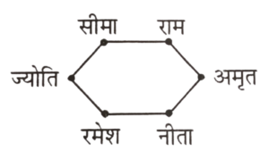 एक मित्रदल का प्रत्येक सदस्य एक षट्भुज के एक-एक कोण में बैठा हुआ है। राम, रमेश के विपरीत बैठा है। ज्योति, सीमा के बगल में बैठी है। नीता, सीमा के विपरीत बैठी है, किन्तु वह राम के बगल में नहीं है। रमेश एवं अमृत के बीच एक व्यक्ति है।
