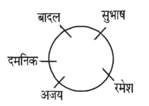 10. पाँच लड़के वृत्ताकार घेरा बनाकर खड़े हैं। 'अजय' रमेश और दमनिक के बीच में है। 'सुभाष' बादल की बायीं ओर है। 'रमेश' सुभाष की बायीं ओर है। बताएँ कि अजय की ठीक दायीं ओर कौन है ? [आरआरबी भोपाल सहायक स्टेशन मास्टर परीक्षा 21.11.1999]