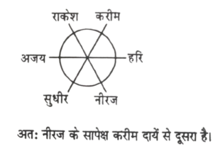 22. छः व्यक्ति केन्द्र की ओर मुख करके एक गोले में बैठकर खेल रहे हैं। अजय, सुधीर के बायें है। करीम, राकेश व हरि के मध्य में है। नीरज, करीम के बायें से दूसरा है। नीरज के सापेक्ष करीम की स्थिति क्या है? [आरआरबी गोरखपुर सहायक स्टेशन मास्टर परीक्षा 02.11.2003]