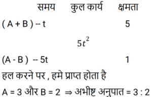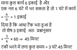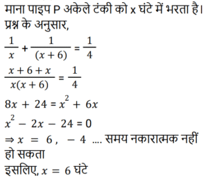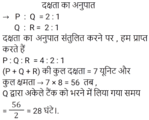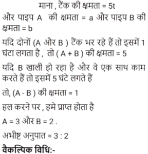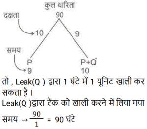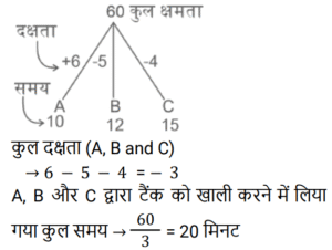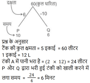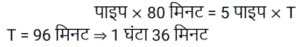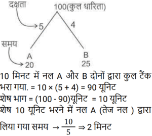 पाइप और टंकी Part-2Total Questions: 391. एक टैंक को 1 घंटे 20 मिनट में भरने के लिए सभी समान प्रकार के 6 पाइपों की आवश्यकता होती है। यदि एक ही प्रकार के केवल 5 पाइपों का उपयोग किया जाए तो इसमें कितना समय लगेगा? [RRB NTPC 10/02/2021 (Morning)](a) 1 घंटा 63 मिनट (b) 1 घंटा 40 मिनट (c) 1 घंटा 36 मिनट(d) 5 घंटेCorrect Answer: (c) 1 घंटा 36 मिनटSolution:2. पाइप A और B एक टैंक में लगे हैं। A फिलिंग पाइप है और B का उपयोग उसी दर से भरने या खाली करने के लिए किया जा सकता है। जब B का उपयोग भरने के लिए किया जाता है, तो टैंक को भरने में A के साथ-साथ t समय लगता है। यदि A टैंक को भरते समय इसे खाली करने के लिए उपयोग किया जाता है, तो टैंक को भरने में लगने वाला समय 5t होगा। A और B की दरों का अनुपात ज्ञात कीजिए। [RRB NTPC 03/04/2021 (Morning)](a) 5 : 1(b) 1 : 3(c) 3 : 2(d) 2 : 3Correct Answer: (c) 3 : 2Solution:3. एक नल, एक टैंक को 6 घंटे में भर सकता है। आधा टैंक भर जाने के बाद, तीन और समान नल खोले जाते हैं। टैंक को भरने में कुल कितना समय लगेगा? [RRB JE 31/05/2019 (Evening)](a) 2 घंटा 20 मिनट (b) 4 घंटा 30 मिनट(c) 3 घंटा 25 मिनट (d) 3 घंटा 45 मिनटCorrect Answer: (d) 3 घंटा 45 मिनटSolution: 4. एक इनलेट पाइप एक टैंक को 10 मिनट में भर देगा। टैंक में दो आउटलेट हैं, जो अलग-अलग क्रमशः 12 और 15 मिनट में टैंक को खाली कर सकते हैं। यदि सभी पाइपों को खोल दिया जाता है और टैंक में पानी भरना शुरू हो जाता है, तो टैंक कितने समय में पूरा भर जाएगा या पूरा खाली हो जाएगा? [RRB JE 01/06/2019 (Morning)](a) 20 मिनट में खाली हो जाएगा(b) 36 मिनट में भर जाएगा(c) 18 मिनट में खाली हो जाएगा(d) 75 मिनट में भर जाएगाCorrect Answer: (a) 20 मिनट में खाली हो जाएगाSolution:5. टैंक ‘A’ का ⅖-वां हिस्सा पानी से भरा है। पाइप P, इसे 10 मिनट में भर सकता है जबकि पाइप Q, इसे 6 मिनट में खाली कर सकता है। यदि P और Q, दोनों को एक साथ खोल दिया जाए, तो टैंक कितने समय में खाली हो जाएगा? [RRB JE 01/06/2019 (Morning)](a) 7 मिनट (b) 6 मिनट(c) 6.5 मिनट (d) 5.5 मिनटCorrect Answer: (b) 6 मिनटSolution:6. दो नल अलग-अलग एक टंकी को क्रमशः 20 मिनट और 25 मिनट में भर सकते हैं। दोनों नल 10 मिनट के लिए खोले जाते हैं, जिसके बाद धीमे नल को बंद कर दिया जाता है। टंकी के शेष हिस्से को अकेले भरने में दूसरे नल को कितना समय लगेगा? [RRB JE 01/06/2019 (Afternoon)](a) 10 मिनट (b) 4 मिनट(c) 5 मिनट (d) 2 मिनटCorrect Answer: (d) 2 मिनटSolution:7. एक टंकी को 9 घंटे में भरा जा सकता है। लेकिन एक रिसाव के कारण, इसमें एक घंटा अधिक समय लगता है। यदि टंकी पूरा भरा हुआ है, तो रिसाव की वजह से यह कितने समय में खाली हो जाएगा? [RRB JE 01/06/2019 (Evening)](a) 60 घंटे (b) 30 घंटे (c) 90 घंटे(d) 75 घंटेCorrect Answer: (c) 90 घंटेSolution:8. दो पाइप P और Q मिलकर एक टंकी को 4 घंटे में भर सकते हैं। जब दोनों पाइप अलग-अलग खोले जाते हैं, तो Q को इसे पूरा भरने में P की तुलना में 6 घंटे अधिक समय लगेगा। P अकेले टंकी को कितने समय में भर सकता है? [RRB JE 02/06/2019 (Morning)](a) 5 घंटे (b) 6 घंटे(c) 8 घंटे (d) 7 घंटेCorrect Answer: (b) 6 घंटेSolution:9. दो पाइप एक टैंक को क्रमशः 20 और 24 मिनट में भर सकते हैं। टैंक में एक आउटलेट है, जो इसे 3 गैलन प्रति मिनट की दर
