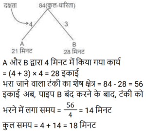31. दो पाइप A और B एक टंकी को क्रमशः 21 मिनट और 28 मिनट में भर सकते हैं। दोनों पाइपों को एक साथ खोल दिया जाता है लेकिन 4 मिनट बाद पाइप B को बंद कर दिया जाता है। टंकी को भरने में कुल कितना समय लगता है? [Group D 17/09/2022 (Afternoon)]