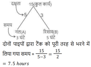 35. एक टंकी की तली में मौजूद एक छिद्र से पानी रिसता है। एक नल, उस टंकी को 3 घंटे में भर सकता है, और तली में मौजूद छिद्र उस पूरी भरी टंकी को 5 घंटे में खाली कर सकता है। यदि नल और छिद्र दोनों एक साथ खोल दिए जाते हैं, तो खाली टंकी को पूरा भरने में कुल कितना समय लगेगा? [Group D 28/09/2022 (Morning)]