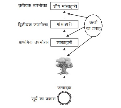 Solution:पारिस्थितिक तंत्र में जैविक संघटकों को दो प्रमुख भागों में विभाजित किया जाता है- (1) स्वपोषी संघटक और (2) परपोषित संघटक । स्वपोषी संघटक (Autotrophic Component) वे होते हैं, जो प्रकाश संश्लेषण तथा रसायन संश्लेषण द्वारा अपना आहार स्वयं निर्मित करते हैं। यह प्राथमिक पोषक या उत्पादक कहलाते हैं। प्राथमिक उपभोक्ता परपोषित जंतु होते हैं, जो स्वपोषित पौधों (प्राथमिक उत्पादक) द्वारा उत्पन्न जैविक तत्वों से अपना आहार ग्रहण करते हैं। द्वितीयक उपभोक्ता प्राथमिक उपभोक्ता से तथा तृतीयक उपभोक्ता प्रायः द्वितीयक उपभोक्ता द्वारा उत्पन्न जैविक तत्वों से अपना आहार प्राप्त करते हैं, जिसे इस प्रकार भी समझा जा सकता है-
