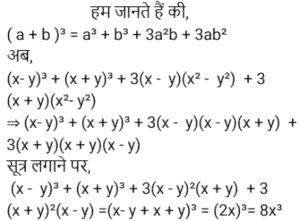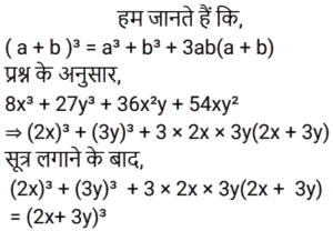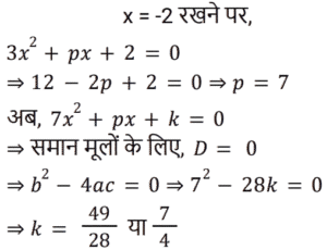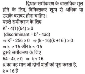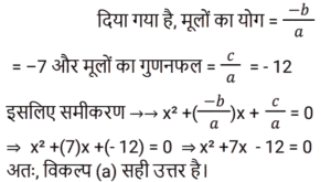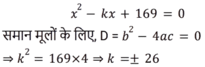 बीजगणित Part-4Total Questions: 5041. नीचे दिए गए विकल्पों में से कौन सा 8x³ + 27y³ + 36x²y + 54xy² के बराबर है? [Group D 22/09/2022 (Morning)](a) (4x + 3y)³(b) (2x + 3y)³(c) (3x + 2y)³(d) (2x + 5y)³Correct Answer: (b) (2x + 3y)³Solution:42. यदि किसी द्विघात समीकरण के मूलों का योग −7 है और उसी समीकरण के मूलों का गुणनफल −12 है, तो वह द्विघात समीकरण निम्न में से कौन-सा होगा? [Group D 22/09/2022 (Morning)](a) x² + 7x − 12 = 0(b) x² + 7x + 12 = 0(c) x² − 7 = 0(d) x² − 12 = 0Correct Answer: (a) x² + 7x − 12 = 0Solution:43. दिए गए व्यंजक को सरल कीजिए: (x − y)³ + (x + y)³ + 3(x − y)(x² − y²) + 3(x + y)(x² − y²) [Group D 22/09/2022 (Morning)](a) 6x³(b) 4x³(c) x³(d) 8x³Correct Answer: (d) 8x³Solution:44. यदि a + b + c = 0, तो ax² + bx + c = 0 समीकरण के मूल क्या हैं? [Group D 22/09/2022 (Afternoon)](a)(b)(c)(d)Correct Answer: (a)Solution:45. समीकरण (x + 4)(x − 4) = 0 के लिए, विविक्तक का मान ______ के बराबर है। [Group D 22/09/2022 (Afternoon)](a) −4(b) 0(c) 64(d) 16Correct Answer: (c) 64Solution:46. सरल कीजिए: (7x − 1)³ + (7x + 1)³ [Group D 22/09/2022 ( Evening ) ](a) −686x³ + 42x(b) −686x³ − 42x(c) 686x³ + 42x(d) 686x³ − 42xCorrect Answer: (d) 686x³ − 42xSolution:47. ‘k’ का वह धनात्मक मान ज्ञात कीजिए, जिसके लिए समीकरण x² + kx + 64 = 0 और x² − 8x + k = 0 दोनों के मूल वास्तविक होंगे। [Group D 22/09/2022 (Evening)](a) 15(b) 17(c) 16(d) 14Correct Answer: (c) 16Solution:48. समीकरण x² + 3a² = 4ax के मूलों का योग क्या होगा? [Group D 22/09/2022 (Evening)](a) 2a(b) a(c) 4a(d) 3aCorrect Answer: (c) 4aSolution:49. यदि समीकरण 3x² + px + 2 = 0 का एक मूल −2 है, और 7x² + px + k = 0 के मूल समान हैं, तो k का मान ज्ञात कीजिए। [Group D 26/09/2022 (Morning)](a) 2/3(b) 7/4(c) 7/2(d) 4/3Correct Answer: (b) 7/4Solution:50. यदि द्विघात समीकरण x² − kx + 169 = 0 के मूल बराबर हों, तो k का मान ज्ञात कीजिए। [Group D 26/09/2022 (Morning)](a) ±26(b) ±14(c) ±13(d) ±17Correct Answer: (a) ±26Solution:Submit Quiz« Previous12345