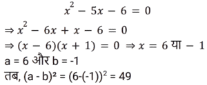 16. यदि a और b समीकरण x² − 5x − 6 = 0 के मूल हैं, तो (a − b)² का मान ज्ञात कीजिए। [Group D 28/09/2022 (Morning)]