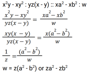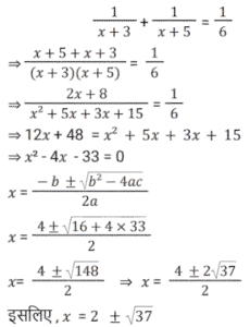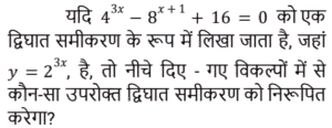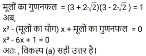 बीजगणित Part-5Total Questions: 5021. यदि दो संख्याओं का अंतर 4 है, और उनका गुणनफल 32 है, तो उनके घनों का निरपेक्ष अंतर (absolute difference) ज्ञात कीजिए। [Group D 28/09/2022 (Evening)](a) 444(b) 484(c) 844(d) 448Correct Answer: (d) 448Solution:22. यदि 2 और −3 एक द्विघात समीकरण के मूल हैं, तो द्विघात समीकरण ज्ञात कीजिए: [Group D 29/09/2022 (Morning)](a) x² + x + 6 = 0(b) x² − x − 6 = 0(c) x² + x − 6 = 0(d) x² − x + 6 = 0Correct Answer: (c) x² + x − 6 = 0Solution:23. निम्नलिखित में से कौन सा विकल्प समीकरण 1/(x + 3) + 1/(x + 5) = 1/6 के हल को दर्शाता है? [Group D 29/09/2022 (Morning)](a) x = 2 ± √37(b) x = 2 ± √39(c) x = 3 ± √37(d) x = 4 ± √37Correct Answer: (a) x = 2 ± √37Solution:24. दिए गए व्यंजक को सरल कीजिए: 2(2x − 3) + 4(x²/2 − 3x + 4) [Group D 29/09/2022 (Morning)](a) 2x² − 8x + 10(b) 2x² + 8x + 10(c) 2x² + 8x − 10(d) 2x² − 8x − 10Correct Answer: (a) 2x² − 8x + 10Solution:25. दिए गए प्रश्न का उत्तर ज्ञात कीजिए ? [Group D 29/09/2022 (Morning)](a) 4y² − 8y + 16 = 0(b) y² − 8y + 16 = 0(c) 4y² − 4y + 16 = 0(d) y² − 4y + 16 = 0Correct Answer: (b) y² − 8y + 16 = 0Solution:26. यदि a = 28 − 5√12 और b = 2 + √3 है, तो (a√3 + b) का मान ज्ञात कीजिए। [Group D 29/09/2022 (Afternoon)](a) 31 − 8√3(b) 32 + 27√3(c) −30 + 30√3(d) −28 + 29√3Correct Answer: (d) −28 + 29√3Solution:27. यदि x ≠ y, और x²y − xy² : yz(x − y) :: xa² − xb² : w, है, तो निम्नलिखित में से कौन-सा विकल्प w के समतुल्य व्यंजक को निरूपित करता है? [Group D 29/09/2022 (Afternoon)](a) za² − zb²(b) a² − b²(c) za² + zb²(d) yza² − yzb²Correct Answer: (a) za² − zb²Solution:28. उस द्विघात समीकरण को पहचानिए जिसका एक मूल 4 + √3 है। [Group D 29/09/2022 (Afternoon)](a) x² − 8x + 11 = 0(b) x² + 8x + 11 = 0(c) x² + 8x + 13 = 0(d) x² − 8x + 13 = 0Correct Answer: (d) x² − 8x + 13 = 0Solution:29. यदि 3 + 2√2 और 3 − 2√2 एक द्विघात समीकरण के मूल हैं, तो समीकरण ज्ञात कीजिए। [Group D 29/09/2022 (Evening)](a) x² − 6x + 1 = 0(b) x² − 6x − 1 = 0(c) x² + 6x + 1 = 0(d) x² + 6x − 1 = 0Correct Answer: (a) x² − 6x + 1 = 0Solution:30. यदि 2xy² : 2x²y :: 2x²y : z तो z के समतुल्य व्यंजक को निरूपित करता विकल्प कौन-सा है? [Group D 29/09/2022 (Evening)](a) 2x³(b) 2x²(c) 4x²y²(d) 4xyCorrect Answer: (a) 2x³Solution:Submit Quiz« Previous12345Next »