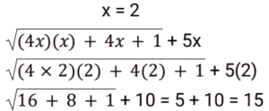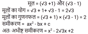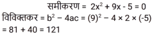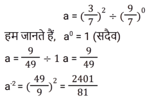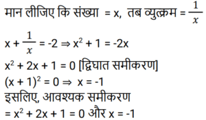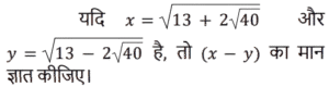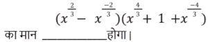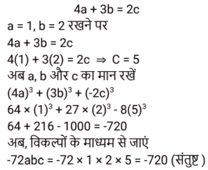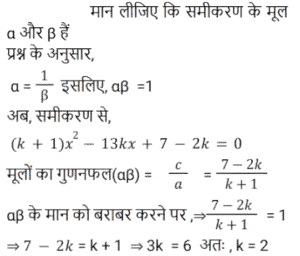 बीजगणित Part-5Total Questions: 5031. समीकरण (k + 1)x² − 13kx + 7 − 2k = 0 का एक मूल दूसरे का व्युत्क्रम है, तो k का मान ज्ञात कीजिए। [Group D 29/09/2022 (Evening)](a) −2(b) 2(c) −4(d) 4Correct Answer: (b) 2Solution:32. दिए गए प्रश्न का उत्तर ज्ञात कीजिए ? [Group D 29/09/2022 (Evening)](a) 3√2(b) 6√2(c) 2√5(d) 4√5Correct Answer: (c) 2√5Solution:33. दिए गए प्रश्न का उत्तर ज्ञात कीजिए ? [Group D 30/09/2022 (Afternoon)](a) 2401/81(b) 81/2401(c) 343/81(d) 81/343Correct Answer: (a) 2401/81Solution:34. दिए गए समीकरण को हल कीजिए: (5x² − 5) + 5(−x² + 2x − 7) = 0 [Group D 30/09/2022 (Afternoon)](a) x = 4(b) x = 2(c) x = −4(d) x = −2Correct Answer: (a) x = 4Solution:35. यदि x = 2 है, तो √(4x·x) + 4x + 1 + 5x का मान ज्ञात कीजिए। [Group D 30/09/2022 (Afternoon)](a) 13(b) 15(c) 9(d) 17Correct Answer: (b) 15Solution:36. द्विघात समीकरण 9x + 2x² = 5 के विविक्तक का मान कितना होगा? [Group D 30/09/2022 ( Evening ) ](a) 41 (b) 184 (c) –176 (d) 121Correct Answer: (d) 121Solution:37. एक संख्या और इसके व्युत्क्रम का योग –2 है। इस परिस्थिति से संबंधित द्विघात समीकरण और संख्या का चयन कीजिए। [Group D 06/10/2022 ( Morning ) ](a) x² + 2x + 1 = 0 , x = 1(b) x² + 2x – 1 = 0 , x = –1(c) x² + 2x + 1 = 0 , x = –1(d) x² – 2x + 1 = 0 , x = –1Correct Answer: (c) x² + 2x + 1 = 0 , x = –1Solution:38. दिए गए प्रश्न का उत्तर ज्ञात कीजिए ? [Group D 06/10/2022 ( Afternoon )](a) 1/x²(b) 0(c) x²(d) x² – 1/x²Correct Answer: (d) x² – 1/x²Solution:39. यदि 4a + 3b = 2c है, (4a)³+(3b)³+(−2c)³ का मान ज्ञात करें। [ Group D 06/10/2022 ( Afternoon )](a) –72abc (b) 0 (c) 72abc (d) 1Correct Answer: (a) –72abc Solution:40. वह द्विघात समीकरण ज्ञात कीजिए जिसके मूल √3 + 1 और √3 – 1 हैं। [Group D 06/10/2022 ( Afternoon ) ](a) x² + 2√3 x + 2 = 0(b) x² – 2√3 x + 4 = 0(c) x² – 2√3 x + 2 = 0(d) x² + √3 x + 2 = 0Correct Answer: (c) x² – 2√3 x + 2 = 0Solution:Submit Quiz« Previous12345Next »