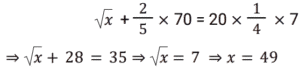 4. यदि √x + (2/5) × 70 = 20 × (1/4) × 7, है तो x का मान ज्ञात कीजिये ? [RRB NTPC 15/02/2021 (Morning)]