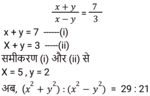 8. यदि (x + y) : (x − y) = 7 : 3, तो (x² + y²) : (x² − y²) का मान ज्ञात कीजिये ? [RRB NTPC 16/02/2021 (Morning)]