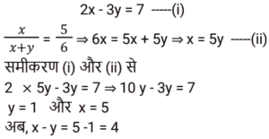 9. यदि 2x − 3y = 7 और x/(x + y) = 5/6 है तो x − y का मान ज्ञात कीजिये ? [RRB NTPC 16/02/2021 (Morning)]