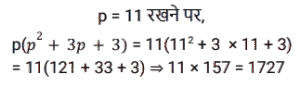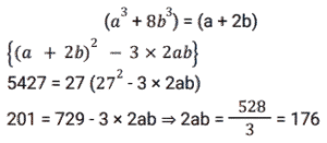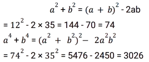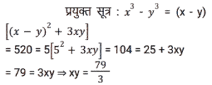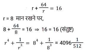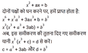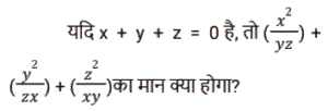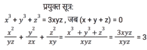 बीजगणित (SSC) (Part-IX)Total Questions: 5041. दिए गए प्रश्न का उत्तर ज्ञात कीजिए ? [Higher Secondary 05/08/2022 (Shift - 2)](a) 1/4(b) 8(c) 1/8(d) 4Correct Answer: (c) 1/8Solution:42. यदि x - y = 5 और x³ - y³= 520, तो xy का मान ज्ञात कीजिए । [Higher Secondary 05/08/2022 (Shift - 2)](a) 79/3(b) 36/5(c) 34/3(d) 76/5Correct Answer: (a) 79/3Solution:43. दिए गए प्रश्न का उत्तर ज्ञात कीजिए ? [SSC CHSL 24/05/2022 (Morning)](a)(b)(c)(d)Correct Answer: (d)Solution:44. यदि 2a + b = 10, 2ab = 9, और 2a > b, तो 2a – b का मान ज्ञात कीजिए। [SSC CHSL 24/05/2022 (Afternoon)](a) 12(b) 6(c) 8(c) 8Correct Answer: (c) 8Solution:45. यदि a + b = 12 और ab = 35 हो, तो a⁴ + b⁴ - 10³ का मान ज्ञात कीजिए। [SSC CHSL 24/05/2022 (Afternoon)](a) 2226(b) 2026(c) 2126(d) 1226Correct Answer: (b) 2026Solution:46. यदि a + 2b = 27 और a³ + 8b³ = 5427 है, तो 2ab का मान ज्ञात कीजिए [SSC CHSL 24/05/2022 (Evening)](a) 176(b) 156(c) 172(d) 149Correct Answer: (a) 176Solution:47. यदि 𝓍² = 𝑏 − 𝑎𝑥 और 𝓍³ (𝓍³ + c)= 𝑑, तो निम्नलिखित में से c और d का मान क्या हो सकते है? [SSC CHSL 25/05/2022 (Morning)](a) 𝑐 = 𝑎³ - 3𝑎𝑏 और 𝑑 = 𝑏³(b) 𝑐 = -𝑎³ - 3𝑎𝑏 और 𝑑 = 𝑏³(c) 𝑐 = 𝑎³ + 3𝑎𝑏 और 𝑑 = 𝑏³(d) 𝑐 = 𝑎³ + 3𝑎𝑏 और 𝑑 = -𝑏³Correct Answer: (c) 𝑐 = 𝑎³ + 3𝑎𝑏 और 𝑑 = 𝑏³Solution:48. यदि 𝑥 + 𝑦 + 𝑧 = 0 है, तो 𝓍³ + y³ + z³ - 3𝓍yz का मान ज्ञात कीजिए। [SSC CHSL 25/05/2022 (Afternoon)](a) 1(b) 𝓍³ + y³ + z³(c) 0(d) 3𝓍yzCorrect Answer: (c) 0Solution:49. दिए गए प्रश्न का उत्तर ज्ञात कीजिए ? [SSC CHSL 25/05/2022 (Evening)](a)(b)(c)(d)Correct Answer: (a)Solution:50. यदि p = 11, तो p(p² + 3p + 3) का मान ज्ञात कीजिए ? [SSC CHSL 25/05/2022 (Evening)](a) 1629(b) 1225(c) 1727(d) 1111Correct Answer: (c) 1727Solution:Submit Quiz« Previous12345