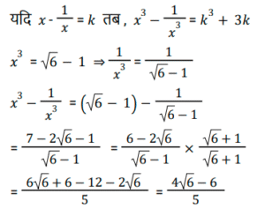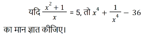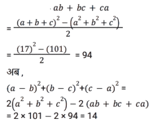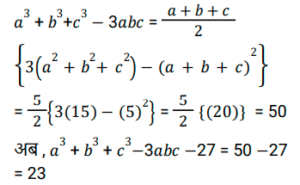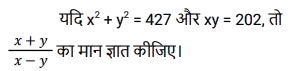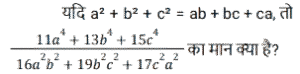 बीजगणित (SSC) (Part-V)Total Questions: 501. दिए गए प्रश्न का उत्तर ज्ञात कीजिए ? [SSC CHSL 08/08/2023 (3rd Shift)](a) 76(b) 66(c) 56(d) 46Correct Answer: (c) 56Solution:2. यदि a + b + c = 5 और a² + b² + c² = 15, तो a³ + b³ + c³ - 3abc - 27 का मान ज्ञात कीजिए। [SSC CHSL 08/08/2023 (3rd Shift)](a) 23(b) 27(c) 25(d) 21Correct Answer: (a) 23Solution:3. दिए गए प्रश्न का उत्तर ज्ञात कीजिए ? [SSC CHSL 08/08/2023 (3rd Shift)](a)(b)(c)(d)Correct Answer: (c)Solution:4. बीजीय व्यंजक 4x² - y² + 6y - 9 ______________ के बराबर है। [SSC CHSL 09/08/2023 (1st Shift)](a) (2x + y - 3)(2x - y + 3)(b) (2x - y - 3)(2x - y + 3)(c) (2x + y - 3)²(d) (2x + y + 3)²Correct Answer: (a) (2x + y - 3)(2x - y + 3)Solution:5. दिए गए प्रश्न का उत्तर ज्ञात कीजिए ? [SSC CHSL 09/08/2023 (1st Shift)](a)(b)(c)(d)Correct Answer: (b)Solution:6. यदि (a + b + c) = 17 और (a² + b² + c²) = 101 है, तो (a - b)² + (b - c)² + (c - a)² का मान ज्ञात कीजिए। [SSC CHSL 09/08/2023 (2nd Shift)](a) 12(b) 14(c) 10(d) 16Correct Answer: (b) 14Solution:7. दिए गए प्रश्न का उत्तर ज्ञात कीजिए ? [SSC CHSL 09/08/2023 (2nd Shift)](a) 491(b) 149(c) 419(d) 194Correct Answer: (a) 491Solution:8. दिए गए प्रश्न का उत्तर ज्ञात कीजिए ? [SSC CHSL 09/08/2023 (3rd Shift)](a) 1⅓(b) 1/4(c) 3/4(d) 1¾Correct Answer: (c) 3/4Solution:9. निम्नलिखित व्यंजक को सरल कीजिए। (c + d)² - (c – d)² [SSC CHSL 09/08/2023 (3rd Shift)](a) 4cd(b) (c² + d²)(c) 2(c² + d²)(d) 2cdCorrect Answer: (a) 4cdSolution:10. निम्नलिखित में से कौन-सा व्यंजक, (𝓍² - 3𝓍 + 2)/(𝓍² - 4) व्यंजक के बराबर है? [SSC CHSL 09/08/2023 (4th Shift)](a)(b)(c)(d)Correct Answer: (b)Solution:Submit Quiz12345Next »