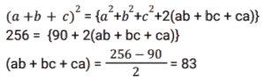 34. यदि (a + b + c) = 16, और (a² + b² + c² ) = 90 है, तो (ab + bc + ca) का मान ज्ञात कीजिए । [SSC CGL 14/07/2023 (1st shift)]