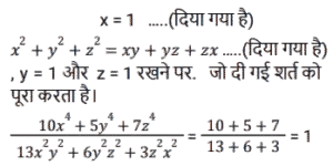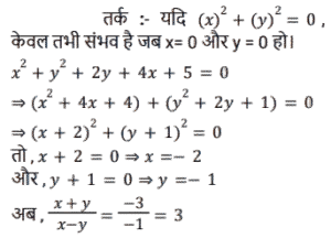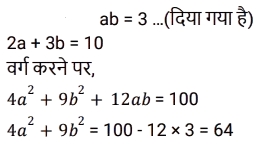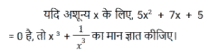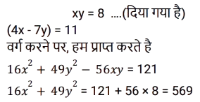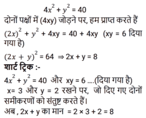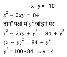 बीजगणित (SSC) (Part-VIII)Total Questions: 501. दिए गए प्रश्न का उत्तर ज्ञात कीजिए ? [SSC CGL 05/12/2022 (4th Shift)](a) 2(b) 0(c) - 1(d) 1Correct Answer: (d) 1Solution:2. यदि x² - 2xy = 84 और x - y = - 10 है, तो y का मान क्या है ? [SSC CGL 05/12/2022 (4th Shift)](a) 2(b) 1(c) 4(d) 3Correct Answer: (c) 4Solution:3. दिए गए प्रश्न का उत्तर ज्ञात कीजिए ? [SSC CGL 06/12/2022 (1st Shift)](a) 1(b) - 1(c) 0(d) - 2Correct Answer: (a) 1Solution:4. दिए गए प्रश्न का उत्तर ज्ञात कीजिए ? [SSC CGL 06/12/2022 (2nd Shift)](a) 0(b) 3(c) 1(d) 2Correct Answer: (a) 0Solution:5. यदि 4x² + y² = 40 और xy = 6 है, तो 2x + y का धनात्मक मान ज्ञात कीजिए। [SSC CGL 06/12/2022 (2nd Shift)](a) 8(b) 6(c) 5(d) 4Correct Answer: (a) 8Solution:6. यदि 2a + 3b = 10 और ab = 3 है, तो 4a² + 9b²का मान ज्ञात कीजिए । [SSC CGL 06/12/2022 (3rd Shift)](a) 60(b) 62(c) 64(d) 66Correct Answer: (c) 64Solution:7. यदि (4x - 7y) = 11 और xy = 8 है, x और y धनात्मक संख्याएं हैं, तो 16x² + 49y² का मान क्या होगा ? [SSC CGL 06/12/2022 (3rd Shift)](a) 596(b) 484(c) 569(d) 448Correct Answer: (c) 569Solution:8. दिए गए प्रश्न का उत्तर ज्ञात कीजिए ? [SSC CGL 06/12/2022 (4th Shift)](a)(b)(c)(d)Correct Answer: (d)Solution:9. दिए गए प्रश्न का उत्तर ज्ञात कीजिए ? [SSC CGL 06/12/2022 (4th Shift)](a) 496/125(b) 532/343(c) 125/532(d) 182/125Correct Answer: (d) 182/125Solution:10. दिए गए प्रश्न का उत्तर ज्ञात कीजिए ? [SSC CGL 07/12/2022 (1st Shift)](a) - 3(b) 1/3(c) -1(d) 3Correct Answer: (d) 3Solution:Submit Quiz12345Next »