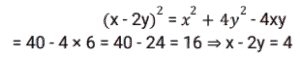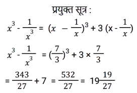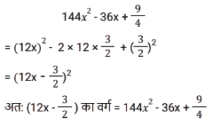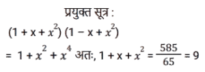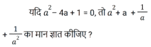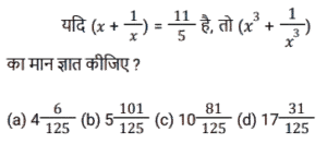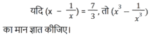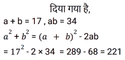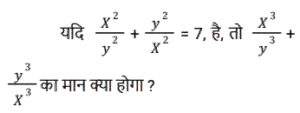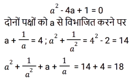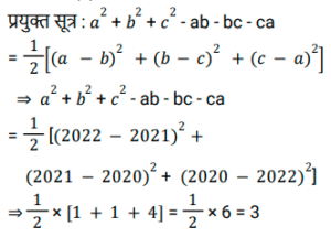 बीजगणित (SSC) (Part-X)Total Questions: 501. दिए गए प्रश्न का उत्तर ज्ञात कीजिए ? [SSC CHSL 26/05/2022 (Morning)](a) 18(b) 15(c) 16(d) 17Correct Answer: (a) 18Solution:2. दिए गए प्रश्न का उत्तर ज्ञात कीजिए ? [SSC CHSL 26/05/2022 (Afternoon)](a) 10(b) 1(c) 18(d) 16Correct Answer: (c) 18Solution:3. दिए गए प्रश्न का उत्तर ज्ञात कीजिए ? [SSC CHSL 26/05/2022 (Afternoon)](a)(b)(c)(d)Correct Answer: (b)Solution:4. दिए गए प्रश्न का उत्तर ज्ञात कीजिए ? [SSC CHSL 26/05/2022 (Evening)](a)(b)(c)(d)Correct Answer: (a)Solution:5. यदि 1 + 𝓍² + 𝓍⁴ = 585 और 1 - 𝓍 + 𝓍² = 65 है, तो 1 + 𝑥 + 𝑥² का मान ज्ञात कीजिए ? [SSC CHSL 26/05/2022 (Evening)](a) 8(b) 7(c) 6(d) 9Correct Answer: (d) 9Solution:6. यदि a = 2022 , b = 2021 और c = 2020 , तो a² + b² + c² – ab – bc - ca का मान ज्ञात कीजिए ? [SSC CHSL 26/05/2022 (Evening)](a) 2(b) 4(c) 3(d) 1Correct Answer: (c) 3Solution:7. यदि 𝓍² + 4y² = 40, 𝑥𝑦 = 6, और x > 2y है, तो x - 2y का मान क्या होगा ? [SSC CHSL 27/05/2022 (Morning)](a) 1(b) 3(c) 2(d) 4Correct Answer: (d) 4Solution:8. यदि 𝓍² - 8𝓍 + 1 = 0 है, तो 𝓍⁸ - 3842𝓍⁴ + 1 का मान क्या होगा ? [SSC CHSL 27/05/2022 (Morning)](a) − 1(b) 0(c) 2(d) 1Correct Answer: (b) 0Solution:9. 144𝓍² - 36𝓍 + 9/4 को ______ के वर्ग के रूप में अभिव्यक्त किया जा सकता है। [SSC CHSL 27/05/2022 (Evening)](a)(b)(c)(d)Correct Answer: (c)Solution:10. दो संख्याओं का योग 17 हैऔर उनका गुणनफल 34 है। उनके वर्गों का योग ज्ञात कीजिए। [SSC CHSL 30/05/2022 (Morning)](a) 224(b) 221(c) 225(d) 222Correct Answer: (b) 221Solution:Submit Quiz12345Next »