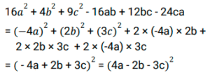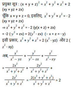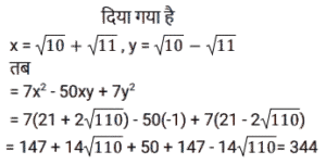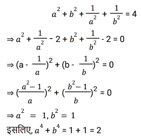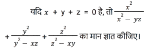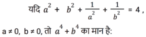 बीजगणित (SSC) (Part-X)Total Questions: 5031. दिए गए प्रश्न का उत्तर ज्ञात कीजिए ? [SSC CHSL 03/06/2022 (Morning)](a) 32(b) 256(c) 64(d) 2Correct Answer: (d) 2Solution:32. यदि a + b + c = 0 है, तो 𝑎² + 𝑏² + 𝑐²/𝑎² - 𝑏𝑐 का मान ज्ञात कीजिए [SSC CHSL 03/06/2022 (Afternoon)](a) −1(c) 2(b) 1(d) −2Correct Answer: (c) 2Solution:33. यदि a - b = 3 और 𝑎³ - 𝑏³ = 999 है, तो 𝑎² - 𝑏² का मान ज्ञात कीजिए ? [SSC CHSL 03/06/2022 (Afternoon)](a) 60(b) 62(c) 64(d) 63Correct Answer: (d) 63Solution:34. यदि (𝑎 − 1)² +(𝑏 + 2)² + (𝑐 − 1)² = 0, तो 𝑎² + 𝑏² + 𝑐² का मान है: [SSC CHSL 06/06/2022 (Morning)](a) 6(b) 0(c) 2(d) 1Correct Answer: (a) 6Solution:35. 16𝑎² + 4𝑏² + 9𝑐² - 16ab + 12bc - 24ca = ? [SSC CHSL 06/06/2022 (Afternoon)](a) (4𝑎 - 2𝑏² + 3𝑐)²(b) (4𝑎 - 2𝑏² - 3𝑐)²(c) (4𝑎 + 2𝑏² - 3𝑐)²(d) (4𝑎 + 2𝑏² + 3𝑐)²Correct Answer: (b) (4𝑎 - 2𝑏² - 3𝑐)²Solution:36. यदि p = 38 है, तो p(𝑝² + 3p + 3) का मान _________ है। [SSC CHSL 06/06/2022 (Evening)](a) 39313(b) 59319(c) 39318(d) 59318Correct Answer: (d) 59318Solution:37. यदि a + b = √7 और a - b = √5 है, तो 8ab (𝑎² + 𝑏²) - (𝑎 - 𝑏)² का मान ज्ञात कीजिए [SSC CHSL 07/06/2022 (Morning)](a) 19(b) 23(c) 27(d) 21Correct Answer: (a) 19Solution:38. यदि P(x) = (𝑥³ - 8) (𝑥 + 1) और Q(x) = (𝑥³+ 1) (𝑥 - 2) है, तो P(x) और Q(x) का लघुत्तम समापवर्त्य (LCM) क्या होगा? [SSC CHSL 07/06/2022 (Afternoon)](a) (𝑥²+ 2𝑥 + 4) (𝑥² + 4𝑥 + 1)(b) (𝑥 + 1)(𝑥 − 2)(𝑥² + 2𝑥 + 4) (𝑥² − 𝑥 + 1)(c) (𝑥 + 1)² (𝑥 − 2)² (𝑥² + 2𝑥 + 4) (𝑥² + 4𝑥 + 1)(d) (𝑥 − 2) (𝑥 + 1)Correct Answer: (b) (𝑥 + 1)(𝑥 − 2)(𝑥² + 2𝑥 + 4) (𝑥² − 𝑥 + 1)Solution:39. दिए गए प्रश्न का उत्तर ज्ञात कीजिए ? [SSC CHSL 07/06/2022 (Evening)](a) 2(b) 1(c) 3(d) 0Correct Answer: (a) 2Solution:40. यदि 𝑥 = √10 + √11, 𝑦 = √10 − √11 है, तो 7𝑥² - 50𝑥y + 7y² का मान ज्ञात कीजिए। [SSC CHSL 08/06/2022 (Morning)](a) 344(b) 704(c) 1360(d) 386Correct Answer: (a) 344Solution:Submit Quiz« Previous12345Next »