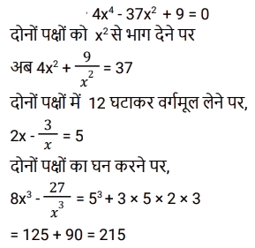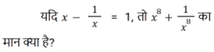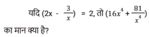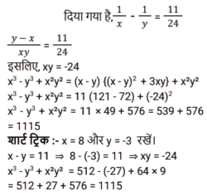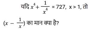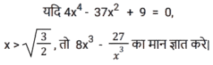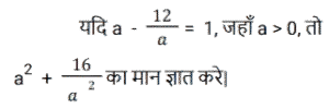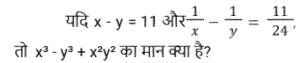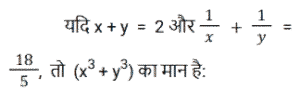 बीजगणित (SSC) (Part-XI)Total Questions: 5031. दिए गए प्रश्न का उत्तर ज्ञात कीजिए ? [SSC CGL 13/08/2021 (Afternoon)](a) 1331(b) 1115(c) 1105(d) 1307Correct Answer: (b) 1115Solution:32. यदि 16x² + y² = 48 और xy = 2, x, y > 0, तो (64x³ + y³) का मान है | [SSC CGL 13/08/2021 (Afternoon)](a) 320(b) 340(c) 300(d) 240Correct Answer: (a) 320Solution:33. दिए गए प्रश्न का उत्तर ज्ञात कीजिए ? [SSC CGL 13/08/2021 (Afternoon)](a) 41/45(b) 45/41(c) 45/49(d) 49/45Correct Answer: (c) 45/49Solution:34. दिए गए प्रश्न का उत्तर ज्ञात कीजिए ? [SSC CGL 13/08/2021 (Evening)](a) 6(b) - 6(c) - 5(d) 5Correct Answer: (d) 5Solution:35. दिए गए प्रश्न का उत्तर ज्ञात कीजिए ? [SSC CGL 13/08/2021 (Evening)](a) 3(b) 119(c) 47(d) - 1Correct Answer: (c) 47Solution:36. यदि a³ + b³ = 405 और a + b = 9, तो ab का मान है : [SSC CGL 16/08/2021 (Morning)](a) 15(b) 10(c) 12(d) 8Correct Answer: (c) 12Solution:37. दिए गए प्रश्न का उत्तर ज्ञात कीजिए ? [SSC CGL 16/08/2021 (Morning)](a) 184(b) 328(c) 180(d) 220Correct Answer: (a) 184Solution:38. दिए गए प्रश्न का उत्तर ज्ञात कीजिए ? [SSC CGL 16/08/2021 (Afternoon)](a) 15(b) 17(c) 11(d) 19Correct Answer: (b) 17Solution:39. दिए गए प्रश्न का उत्तर ज्ञात कीजिए ? [SSC CGL 16/08/2021 (Afternoon)](a) 215(b) - 215(c) 35(d) - 35Correct Answer: (a) 215Solution:40. दिए गए प्रश्न का उत्तर ज्ञात कीजिए ? [SSC CGL 16/08/2021 (Evening)](a)(b)(c)(d)Correct Answer: (a)Solution:Submit Quiz« Previous12345Next »