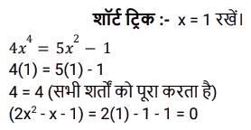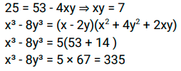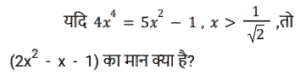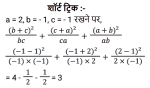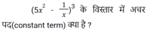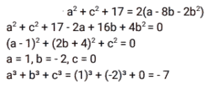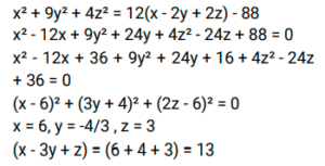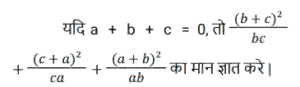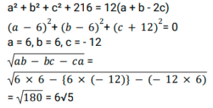 बीजगणित (SSC) (Part-XI)Total Questions: 5041. यदि x² + 4y² = 53 और x - 2y = 5, तो x³ - 8y³ का मान क्या ह [SSC CGL 16/08/2021 (Evening)](a) - 85(b) 335(c) 155(d) 85Correct Answer: (b) 335Solution:42. यदि a² + c² + 17 = 2(a - 8b - 2b²), तो (a³ + b³ + c³) का मान ज्ञात करे | [SSC CGL 17/08/2021 (Morning)](a) 9(b) - 7(c) 10(d) - 4Correct Answer: (b) - 7Solution:43. दिए गए प्रश्न का उत्तर ज्ञात कीजिए ? [SSC CGL 17/08/2021 (Evening)](a) 0(b) 1(c) - 2(d) 2Correct Answer: (a) 0Solution:44. यदि x² + 9y² + 4z² = 12(x - 2y + 2z) - 88, तो (x - 3y + z) का मान है: [SSC CGL 17/08/2021 (Evening)](a) 10(b) 13(c) 11(d) 5Correct Answer: (b) 13Solution:45. निम्नलिखित व्यंजक को सरल कीजिए। [SSC CGL 18/08/2021 (Morning)](a) 15/8(b) 3/4(c) 3/2(d) 27/28Correct Answer: (c) 3/2Solution:46. दिए गए प्रश्न का उत्तर ज्ञात कीजिए ? [SSC CGL 18/08/2021 (Afternoon)](a)(b)(c)(d)Correct Answer: (b)Solution:47. दिए गए प्रश्न का उत्तर ज्ञात कीजिए ? [SSC CGL 18/08/2021 (Afternoon)](a) 5(b) -15(c) 15(d) 75Correct Answer: (c) 15Solution:48. यदि a³ - b³ = 2349 और (a - b) = 9, तो (a + b)² - ab बराबर है | [SSC CGL 18/08/2021 (Evening)](a) 261(b) 280(c) 229(d) 244Correct Answer: (a) 261Solution:49. दिए गए प्रश्न का उत्तर ज्ञात कीजिए ? [SSC CGL 18/08/2021 (Evening)](a) 1(b) - 3(c) -1(d) 3Correct Answer: (d) 3Solution:50. यदि a² + b² + c² + 216 = 12(a + b - 2c) है तो √(𝑎𝑏 − 𝑏𝑐 − 𝑐𝑎) का मान होगा। [SSC CGL 20/08/2021 (Morning)](a) 6√5(b) 4√5(c) 3√5(d) 8√5Correct Answer: (a) 6√5Solution:Submit Quiz« Previous12345