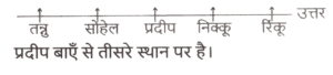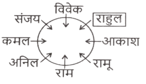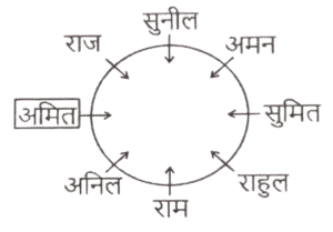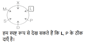 बैठने की व्यवस्था (भाग-III)Total Questions: 5021. U, V, W, X और Y एक वृत्ताकार मेज के चारों ओर केंद्र से बाहर की ओर मुख करके बैठे हैं। U, W के ठीक बाईं ओर बैठा है। X, V और Y के ठीक बीच में बैठा है। W और एक-दूसरे के बगल में बैठे हैं। U के ठीक बाईं ओर कौन बैठा है? [SSC MTS 13/06/2023 (Evening)](a) X(b) W(c) Y(d) VCorrect Answer: (c) YSolution:22. आठ लड़के अनिल, कमल, राम, संजय, आकाश, विवेक, राहुल और रामू एक वृत्ताकार मेज के चारों ओर केंद्र की ओर मुख करके बैठे हैं (परंतु जरूरी नहीं कि वे इसी क्रम में बैठे हों)। विवेक, कमल के दाईं ओर से तीसरे स्थान पर है। कमल, संजय के दाईं ओर से दूसरे स्थान पर है। राम, अनिल के दाईं ओर से दूसरे स्थान पर है। अनिल, विवेक के दाईं ओर से दूसरे स्थान पर है। राहुल, आकाश के दाईं ओर से तीसरे स्थान पर है। अनिल के बाईं ओर से तीसरे स्थान पर कौन है? [SSC MTS 13/06/2023 (Evening)](a) विवेक(b) कमल(c) आकाश(d) रामूCorrect Answer: (d) रामूSolution:23. छः व्यक्ति एक वृत्ताकार मेज के चारों ओर केंद्र की ओर मुख करके बैठे हैं। P और S के बीच केवल D बैठा है। M और L के बीच केवल X बैठा है। S, M के ठीक दाएँ पर बैठा है। P के ठीक दाएँ पर कौन बैठा है? [SSC MTS 14/06/2023 (Afternoon)](a) S(b) M(c) L(d) DCorrect Answer: (c) LSolution:24. पाँच लड़कियाँ A, B, C, D और E एक सीधी रेखा में दक्षिण की ओर मुख करके खड़ी हैं। A, C के ठीक दाईं ओर खड़ी है। D, C और E के बीच में खड़ी है। E किसी भी छोर के आखिर में नहीं खड़ी है। E के बाईं ओर कौन खड़ा है ? [SSC MTS 14/06/2023 (Evening)](a) C(b) D(c) A(d) BCorrect Answer: (d) BSolution:25. आठ लड़के राम, सुमित, सुनील, राहुल, राज, अमन, अमित और अनिल एक वृत्ताकार मेज के चारों ओर केंद्र की ओर मुख करके बैठे हैं (परंतु जरूरी नहीं कि वे इसी क्रम में बैठे हों)। अनिल, राज या राहुल का निकटतम पड़ोसी नहीं है। अनिल, राम के ठीक बाईं ओर है। अमित, राज का निकटतम पड़ोसी है। अमन, सुमित के ठीक दाईं ओर है। सुनील, राज और अमन के बीच में बैठा है। राज और अनिल दोनों का निकटतम पड़ोसी कौन है ? [SSC MTS 14/06/2023 (Evening)](a) राहुल(b) अमित(c) सुनील(d) अमनCorrect Answer: (b) अमितSolution:26. आठ मित्र अनिल, कमल, राम, संजय, आकाश, विवेक, राहुल और रामू एक वृत्ताकार मेज के चारों ओर केंद्र की ओर मुख करके बैठे हैं (परंतु जरूरी नहीं कि वे इसी क्रम में बैठे हों)। विवेक, अनिल के दाईं ओर से दूसरे स्थान पर है। कमल, अनिल के बाईं ओर से तीसरे स्थान पर है। रामू, विवेक के दाईं ओर से दूसरे स्थान पर है। राम, रामू के दाई ओर से दूसरे स्थान पर है। [SSC MTS 15/06/2023 (Morning)]आकाश, राहुल के दाईं ओर से दूसरे स्थान पर है। राहुल, विवेक का निकटतम पड़ोसी नहीं है। आकाश के दाईं ओर से तीसरे स्थान पर कौन है?(a) कमल(b) राम(c) विवेक(d) रामूCorrect Answer: (d) रामूSolution:रामू आकाश के दायें से तीसरे स्थान पर है।27. सात लड़कियाँ A, B, C, D, E, F और G एक वृत्ताकार मेज के चारों ओर केंद्र से विपरीत दिशा की ओर मुख करके बैठी हैं (परंतु जरूरी नहीं कि वे इसी क्रम में बैठीं हों)। D, G के दाईं ओर से दूसरे स्थान पर है। G, C के दाईं ओर से तीसरे स्थ