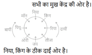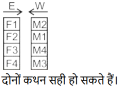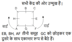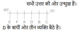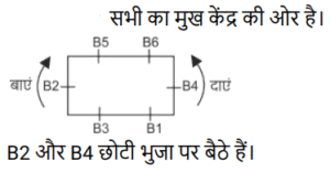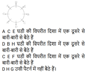 बैठने की व्यवस्था (भाग-IV)Total Questions: 3731. 6 व्यक्ति A, B, C, D, E और F एक पंक्ति में उत्तर की ओर मुख करके (आवश्यक नहीं है कि इसी क्रम में हों) बैठे हैं। A, D और F का सन्निकट पड़ोसी है। F, E और A का सन्निकट पड़ोसी है। B दाएँ छोर से दूसरे स्थान पर है। यदि D किसी भी छोर पर नहीं है, तो D के बाईं ओर कितने व्यक्ति बैठे हैं? [SSC MTS 19/07/2022 (Evening)](a) 2(b) 1(c) 5(d) 3Correct Answer: (d) 3Solution:32. आठ लड़कियाँ A, B, C, D, E, F, G और H एक वृत्ताकार मेज़ के केंद्र से विमुख होकर (आवश्यक नहीं है कि इसी क्रम में हों) बैठी हैं। B, D के बाईं ओर दूसरे स्थान पर बैठी है। F, B के बाईं ओर तीसरे स्थान पर बैठी है। A, F के बाईं ओर दूसरे स्थान पर बैठी है। C, A के बाईं ओर दूसरे स्थान पर बैठी है। G, E के बाईं ओर तीसरे स्थान पर बैठी है। चार विकल्पों में से तीन एक निश्चित तर्क के आधार पर एक समान हैं और एक समूह का निर्माण करते हैं। निम्नलिखित में से कौन सा विकल्प उस समूह से संबंधित नहीं है? [SSC MTS 20/07/2022 (Morning)](a) A, C, E(b) D, B, H(c) D, H, G(d) C, E, FCorrect Answer: (c) D, H, GSolution:33. आठ मित्र, जय, किंग, लीजा, मॉन, निया, ओरी, पियू और रिया, एक वृत्ताकार मेज़ के केंद्र की ओर अभिमुख होकर बैठे हैं। जय, पियू के दायीं ओर दूसरे स्थान पर बैठा है, जो कि किंग के दायीं ओर तीसरे स्थान पर बैठी है। मॉन, ओरी के बायीं ओर दूसरे स्थान पर बैठा है, जो कि पियू और जय के बीच में बैठी है। लीजा, किंग या निया की पड़ोसन नहीं है। किंग के बिल्कुल बगल में दायीं ओर कौन बैठा/बैठी है? [SSC MTS 21/07/2022 (Morning)](a) पियू(b) मॉन(c) ओरी(d) नियाCorrect Answer: (d) नियाSolution:34. 6 लड़के B1, B2, B3, B4, B5 और B6 एक आयताकार मेज़ के चारों ओर मेज़ के केंद्र की ओर मुख करके (आवश्यक नहीं है कि इसी क्रम में हों) बैठे हैं। दो लड़के मेज़ की प्रत्येक लंबी भुजा पर और एक लड़का मेज़ की प्रत्येक छोटी भुजा पर बैठा है। B1, B6 के बाईं ओर दूसरे स्थान पर बैठा है। B4, B5 के बाईं ओर दूसरे स्थान पर बैठा है। B5, B6 और B2 का सन्निकट पड़ोसी है। B5, B4 के सामने नहीं बैठा है। B1 छोटी भुजा पर नहीं बैठा है। लड़कों का कौन सा युग्म आयताकार मेज़ की छोटी भुजा पर बैठा है? [SSC MTS 21/07/2022 (Morning)](a) B1 और B4(b) B4 और B2(c) B2 और B3(d) B6 और B3Correct Answer: (b) B4 और B2Solution:35. आठ लड़के A, B, C, D, E, F, G और H एक वर्गाकार मेज़ के चारों ओर, मेज़ के केंद्र की ओर मुख करके (आवश्यक नहीं हैकि इसी क्रम मेंहों) बैठे हैं। 4 लड़के प्रत्येक कोने में बैठे हैं, और 4 लड़के मेज़ की प्रत्येक भुजा के बीचो बीच बैठे हैं। A, H और G का सन्निकट पड़ोसी है। A एक कोने में बैठा है। B, D और C का सन्निकट पड़ोसी है। E, C और F का सन्निकट पड़ोसी है। G, D के दाईं ओर तीसरे स्थान पर बैठा है। निम्नलिखित चार विकल्पों में से तीन एक समान नियम का अनुसरण करते हैं और एक समूह का निर्माण करते हैं। निम्नलिखित में से कौन सा विकल्प उस समूह से संबंधित नहीं है? [SSC MTS 25/07/2022 (Morning)](a) EB(b) BH(c) AF(d) GCCorrect Answer: (d) GCSolution:36. पाँच लड़कियाँ A, B, C, Z और U दक्षिण की ओर मुँह करके एक पंक्ति में बैठी हैं (लेकिन 
