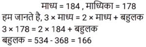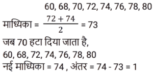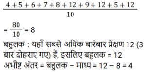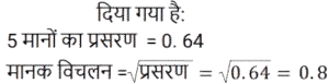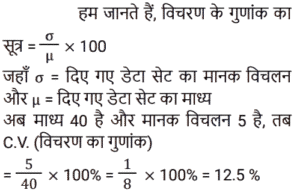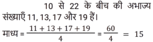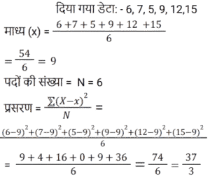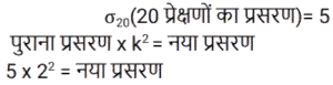 माध्य, माध्यिका और बहुलकTotal Questions: 5011. प्रेक्षण के बहुलक और माध्य में क्या अंतर है? [NTPC CBT II Level 6 (09/05/2022) Shift 1]4, 5, 6, 7, 8, 12, 9, 12, 5, 12(a) 4(b) 4.2(c) 5.1(d) 4.6Correct Answer: (a) 4Solution:माध्य = 12. 10 और 22 के बीच की सभी अभाज्य संख्याओं का माध्य क्या होगा? [NTPC CBT II Level 4 (10/05/2022) Shift 1](a) 13(b) 15(c) 16(d) 14Correct Answer: (b) 15Solution:13. यदि एक अवलोकन 70 को डेटा 60, 68, 70, 72, 74, 76, 78, 80 से हटा दिया जाता है तो माध्यिका कितनी बढ़ जाती है? [NTPC CBT II Level 2 (13/06/2022) Shift 2](a) 0.5(b) 1(c) 1.5(d) 2Correct Answer: (b) 1Solution:14. 750 प्रतिभागियों द्वारा उठाए गए अधिकतम वजन को दर्ज किया गया है और यह पाया गया है कि इस वितरण का माध्य और माध्यिका दोनों बहुलक से अधिक हैं। यदि माध्य और माध्यिका क्रमशः 184 किग्रा और 178 किग्रा हैं, तो निम्न में से कौन सा है बहुलक का सर्वाधिक संभावित मान (किग्रा) है। [NTPC CBT II Level 2 (13/06/2022) Shift 2](a) 168(b) 172(c) 162(d) 166Correct Answer: (d) 166Solution:15. यदि माध्य 40 है और मानक विचलन 5 है, तो C.V (भिन्नता गुणांक) कितना होगा? [NTPC CBT-I 30/12/2020 (Morning)](a) 5.5%(b) 20.5%(c) 100%(d) 12.5%Correct Answer: (d) 12.5%Solution:16. निम्नलिखित डेटा बिंदुओं का प्रसरण ज्ञात कीजिए: [NTPC CBT-I 03/02/2021 (Evening)]6, 7, 5, 9, 12, 15(a) 37/6(b) 67/6(c) 81/3(d) 37/3Correct Answer: (d) 37/3Solution:17. निम्नलिखित में से कौन ऋणात्मक मान नहीं ले सकता है? [NTPC CBT-I 10/02/2021 (Morning)](a) मानक विचलन(b) माध्यक(c) माध्य(d) विषमताCorrect Answer: (a) मानक विचलनSolution:मानक विचलन ऋणाक मान नही ले सकता।18. 20 प्रेक्षणों का प्रसरण 5 है। यदि प्रत्येक प्रेक्षण को 2 से गुणा किया जाए, तो परिणामी प्रेक्षण का प्रसरण क्या होगा? [NTPC CBT-I 10/02/2021 (Evening)](a) 5(b) 2 × 5(c) 2² × 5(d) 2 × 5²Correct Answer: (c) 2² × 5Solution:19. यदि 5 मानों का प्रसरण 0.64 है, तो इसका मानक विचलन क्या होगा? [NTPC CBT-I 31/07/2021 (Evening)](a) 5.64(b) 0.128(c) 3.2(d) 0.8Correct Answer: (d) 0.8Solution:20. पहली 10 क्रमागत विषम संख्याओं का माध्य (mean) ज्ञात कीजिए। [RRB JE 02/06/2019 (Afternoon)](a) 15(b) 11(c) 10(d) 13Correct Answer: (c) 10Solution:Submit Quiz« Previous12345Next »