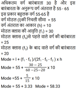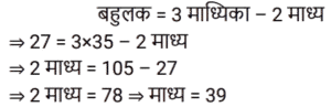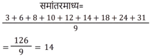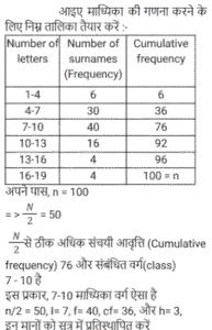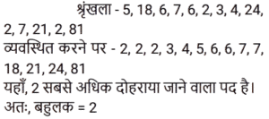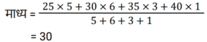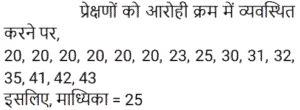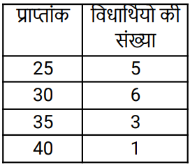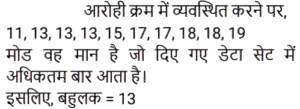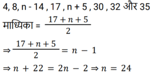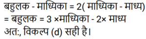 माध्य, माध्यिका और बहुलक Part-2Total Questions: 501. प्रेक्षण 20, 23, 25, 30, 20, 31, 32, 35, 20, 41, 42, 43, 20, 20 और 20 की माध्यिका ज्ञात कीजिए। [Group D 12/09/2022 (Evening)](a) 23(b) 25(c) 26(d) 28Correct Answer: (b) 25Solution:2. प्रेक्षण 3, 6, 8, 10, 12, 14, 18, 24 और 31 का समांतर माध्य ज्ञात कीजिए। [Group D 13/09/2022 (Afternoon)](a) 15(b) 17(c) 16(d) 14Correct Answer: (d) 14Solution:3. एक स्थानीय टेलीफोन निर्देशिका से यादृच्छिक रूप से 100 उपनामों का चयन किया जाता है, और उपनामों में अंग्रेजी वर्णमाला से अक्षरों की संख्या का बारंबारता बंटन निम्नानुसार प्राप्त होता है। [Group D 13/09/2022 (Evening)]संदर्भ: [Number of letters – अक्षरों की संख्या,Number of surnames – उपनामों की संख्या] उपनामों में अक्षरों की संख्या की माध्यिका ज्ञात कीजिए।(a) 8.05(b) 7.09(c) 8.02(d) 7.04Correct Answer: (a) 8.05Solution:4. नीचे दिए आँकड़ों का बहुलक ज्ञात कीजिए। (दो दशमलव स्थानों तक पूर्णांकित उत्तर दीजिए) [Group D 14/09/2022 (Morning)](a) 58.33(b) 63.33(c) 57.33(d) 55.33Correct Answer: (a) 58.33Solution: 5. नीचे 10 विद्यार्थियों के प्राप्तांक दिए गए हैं। 17, 13, 18, 11, 15, 13, 19, 18, 13, 17 उपरोक्त आँकड़ों का बहुलक ज्ञात कीजिए। [Group D 14/09/2022 (Evening)](a) 13(b) 17(c) 11(d) 19Correct Answer: (a) 13Solution:6. यदि बंटन का बहुलक 27 है और इसकी माध्यिका 35 है, तो बंटन का माध्य ज्ञात कीजिए (मूलानुपाती संबंध का उपयोग करते हुए)। [Group D 15/09/2022 (Evening)](a) 39(b) 62(c) 37.5(d) 43.5Correct Answer: (a) 39Solution:7. 5, 18, 6, 7, 6, 2, 3, 4, 24, 2, 7, 21, 2, 81 का बहुलक क्या है? [Group D 17/09/2022 (Morning)](a) 6(b) 2(c) 81(d) 7Correct Answer: (b) 2Solution:8. निम्नलिखित बंटन के माध्य अंक ज्ञात कीजिए। [Group D 17/09/2022 (Evening)](a) 32(b) 31(c) 29(d) 30Correct Answer: (d) 30Solution:9. आरोही क्रम में दिए गए नीचे दिए गए प्रेक्षणों की माध्यिका n−1 है। [Group D 19/09/2022 (Morning)]4, 8, n−14, 17, n+5, 30, 32 और 35 n का मान क्या है?(a) 18(b) 19(c) 24(d) 17Correct Answer: (c) 24Solution:10. निम्नलिखित में से कौन सा व्यंजक सही है? [Group D 19/09/2022 (Morning)]1.बहुलक − माध्यिका = 2(माध्यिका − माध्य) 2.माध्यिका = (बहुलक + माध्यिका) / 2 3.बहुलक = 2 माध्यिका − माध्य 4.माध्य = (2 माध्यिका − बहुलक) / 2(a) 2(b) 4(c) 3(d) 1Correct Answer: (d) 1Solution:Submit Quiz12345Next »