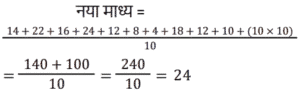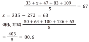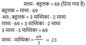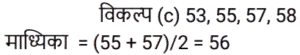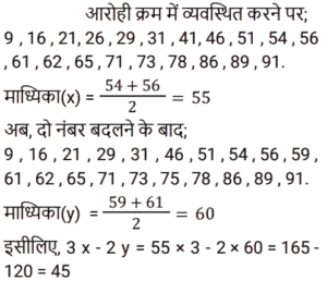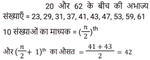 माध्य, माध्यिका और बहुलक Part-2Total Questions: 5041. दिए गए प्रश्न का उत्तर ज्ञात कीजिए ? [Level 5 (15/06/2022) Shift 2 ](a) 1(b) 3(c) 2(d) 4Correct Answer: (d) 4Solution:42. 53 से शुरू होने वाले चार संख्याओं के एक समुच्चय को सबसे छोटे से सबसे बड़े के क्रम में व्यवस्थित किया जाता है। यदि इस समुच्चय की माध्यिका 56 है, तो निम्न में से कौन सा संभवतः यह समुच्चय होगा? [Level 5 (15/06/2022) Shift 2](a) 53, 57, 61, 65(b) 53, 53, 57, 59(c) 53, 55, 57, 58(d) 53, 56, 59, 62Correct Answer: (c) 53, 55, 57, 58Solution:43. किसी निश्चित अवलोकन के माध्य और बहुलक के बीच का अंतर 69 है, तो माध्य और माध्यिका के बीच का अंतर _____ है। [Level 5 (15/06/2022) Shift 3](a) 24(b) 21(c) 23(d) 22Correct Answer: (c) 23Solution:44. यदि संख्याओं 33, x, 47, 83 और 109 का माध्य 67 है, तो 50, 64, 100, 126 और x का माध्य क्या है? [Level 5 (15/06/2022) Shift 3](a) 80.6(b) 80(c) 81.8(d) 84Correct Answer: (a) 80.6Solution:45. आँकड़ों 16, 78, 26, 91, 29, 71, 31, 46, 9, 51, 54, 56, 61, 21, 62, 65, 73, 86, 41, 89 की माध्यिका x है। मान लीजिए कि उपरोक्त आँकड़ों में 26 और 41 को क्रमशः 59 और 75 से प्रतिस्थापित करने पर प्राप्त आँकड़ों की माध्यिका y होगी। (3x − 2y) का मान कितना होगा? [Level 2 (16/06/2022) Shift 1](a) 38(b) 54(c) 49(d) 45Correct Answer: (d) 45Solution:46. यदि 14, 22, 16, 24, 12, 8, 4, 18, 12, 10 के प्रत्येक प्रेक्षण में 10 की वृद्धि कर दी जाए, तो उनका नया माध्य क्या होगा? [Level 2 (16/06/2022) Shift 1](a) 26(b) 24(c) 14(d) 16Correct Answer: (b) 24Solution:47. 12 संख्याओं को आरोही क्रम में व्यवस्थित किया गया है। यदि अंतिम 11 संख्याओं का माध्य 9 है और सभी 12 संख्याओं का माध्य 11 है, तो दूसरी संख्या का मान ज्ञात कीजिए, जो पहली संख्या से 66⅔% अधिक है। [Level 2 (16/06/2022) Shift 2](a) 54(b) 53(c) 55(d) 56Correct Answer: (c) 55Solution:48. किसी समूहित आँकड़ों के वर्ग 10–19, 20–29, 30–39, 40–49, 50–59, 60–69, 70–79, 80–89 और 90–99 के लिए, निम्न में से कौन सा वर्ग अंतराल 70–79 की ऊपरी सीमा है? [Level 2 (16/06/2022) Shift 2](a) 79(b) 70(c) 79.5(d) 69.5Correct Answer: (c) 79.5Solution:49. यदि 14, 6, 2a और 16 का माध्य 12 है, तो a का मान ज्ञात कीजिए, जहाँ a > 0 है। [Level 2 (16/06/2022) Shift 3](a) 8(b) 6(c) 5(d) 4Correct Answer: (b) 6Solution:50. 20 और 62 के बीच की सभी अभाज्य संख्याओं की माध्यिका क्या होगी? [Level 2 (16/06/2022) Shift 3](a) 38(b) 42(c) 41(d) 39Correct Answer: (b) 42Solution:Submit Quiz« Previous12345